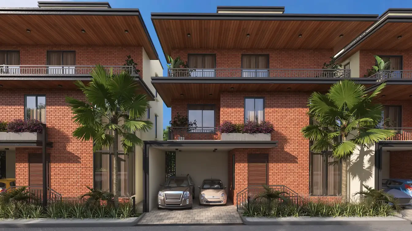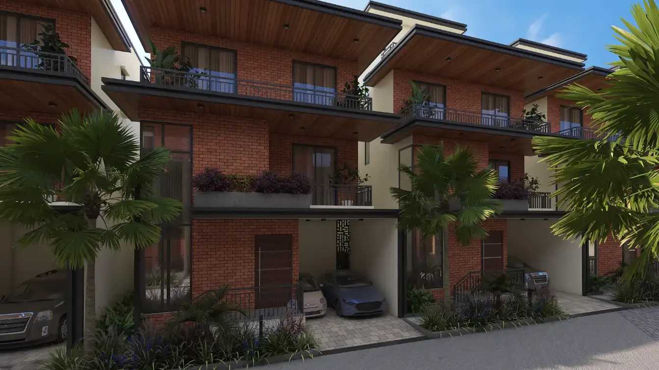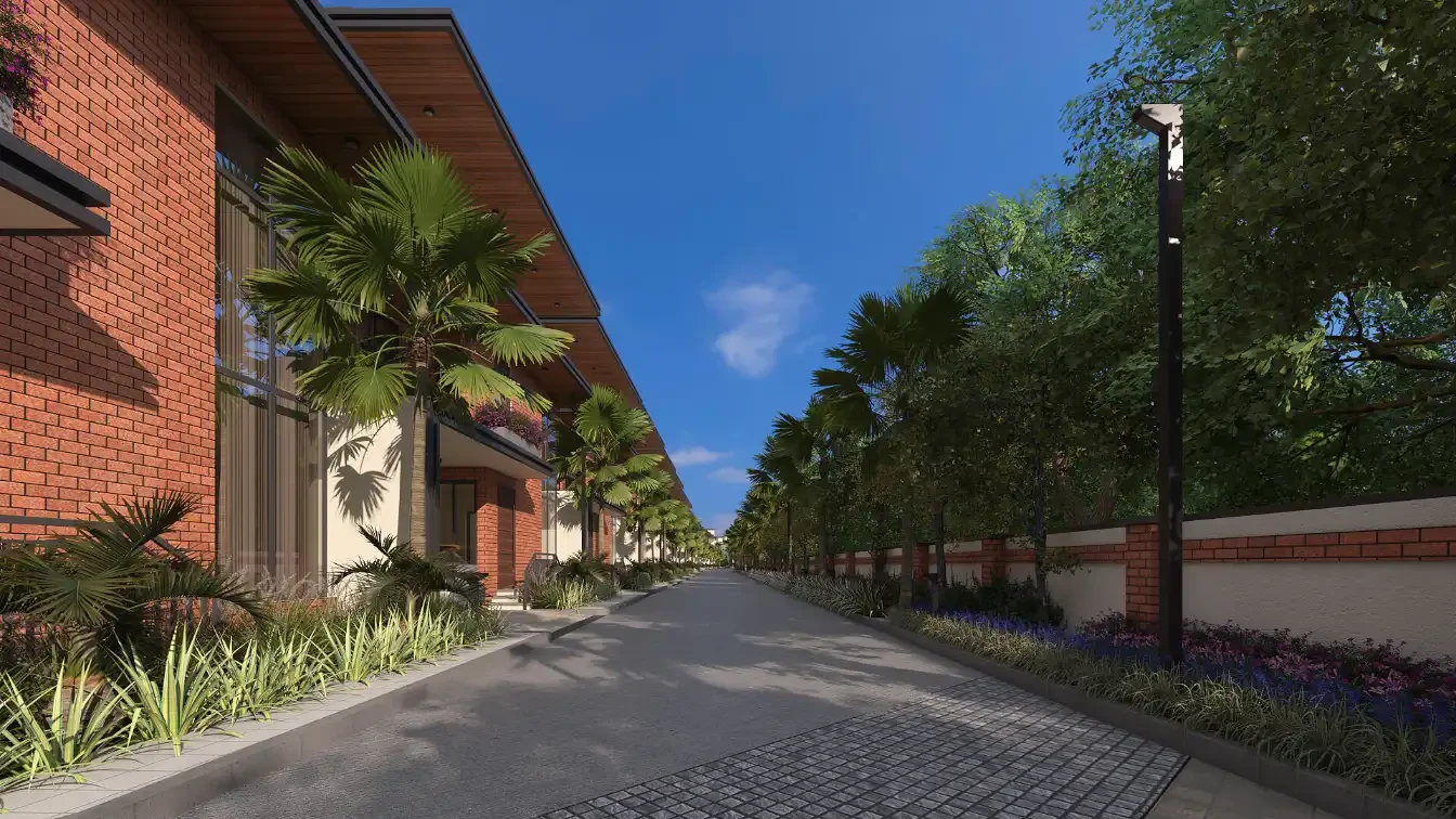Architecture: Earthy brick facades, double-height living areas, and Vaastu-compliant layouts.