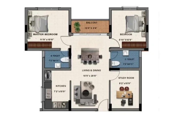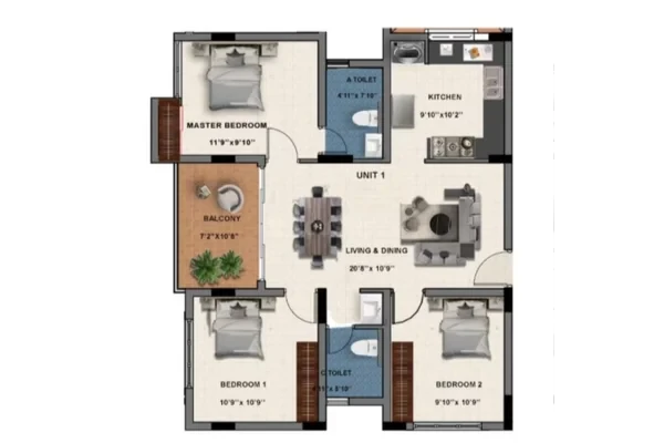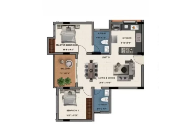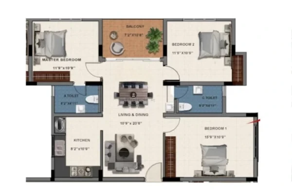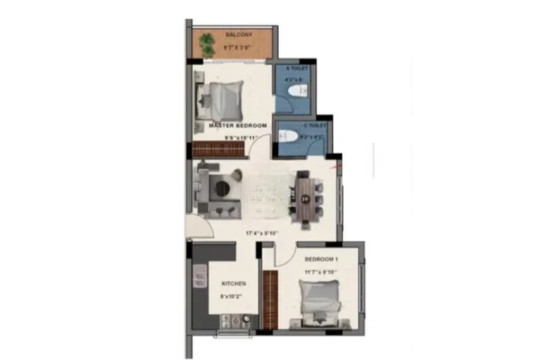 Vitrified Tiles - All areas of flat inside except Balcony, Toilet & Service.