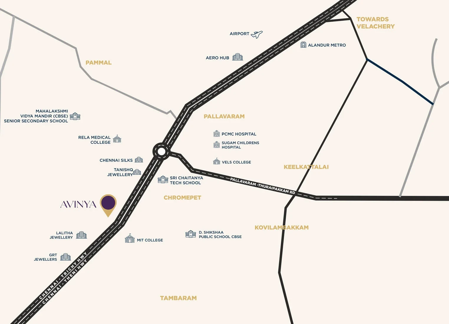 Raunaq Avinya is a premium, 49-unit residential development in Chrompet, Chennai, offering 2 and 3 BHK apartments with modern, spacious, and functional designs. Located at Door No. 3, 3rd Main Road, New Colony, it provides high-end amenities, including a children's play area, and boasts excellent connectivity to schools, hospitals, and transport.