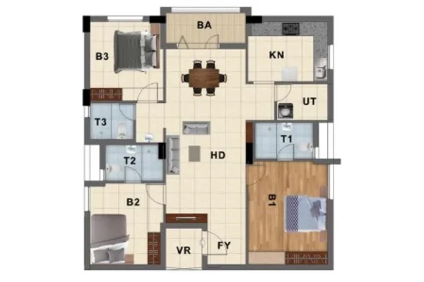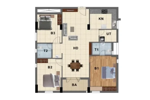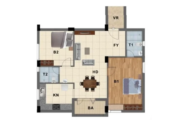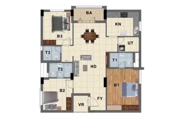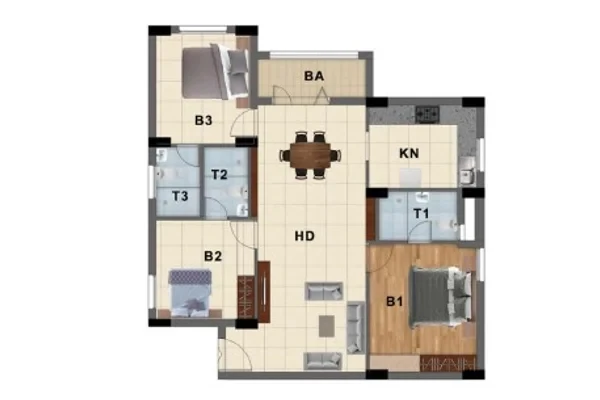 Living, dining, kitchen and bedrooms will have vitrified tile flooring of 600mm x 600mm.
