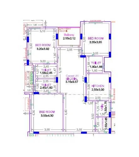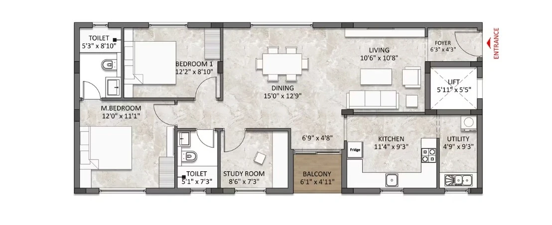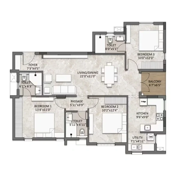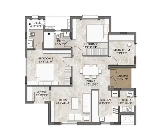 Vitrified tiles for foyer, living, dining, bedrooms and kitchen.