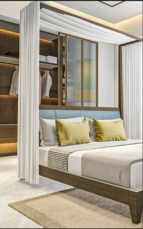 Main Door: Factory made solid/engineered wood frame, solid core shutter with teak veneer on both sides, finished with PU coat.