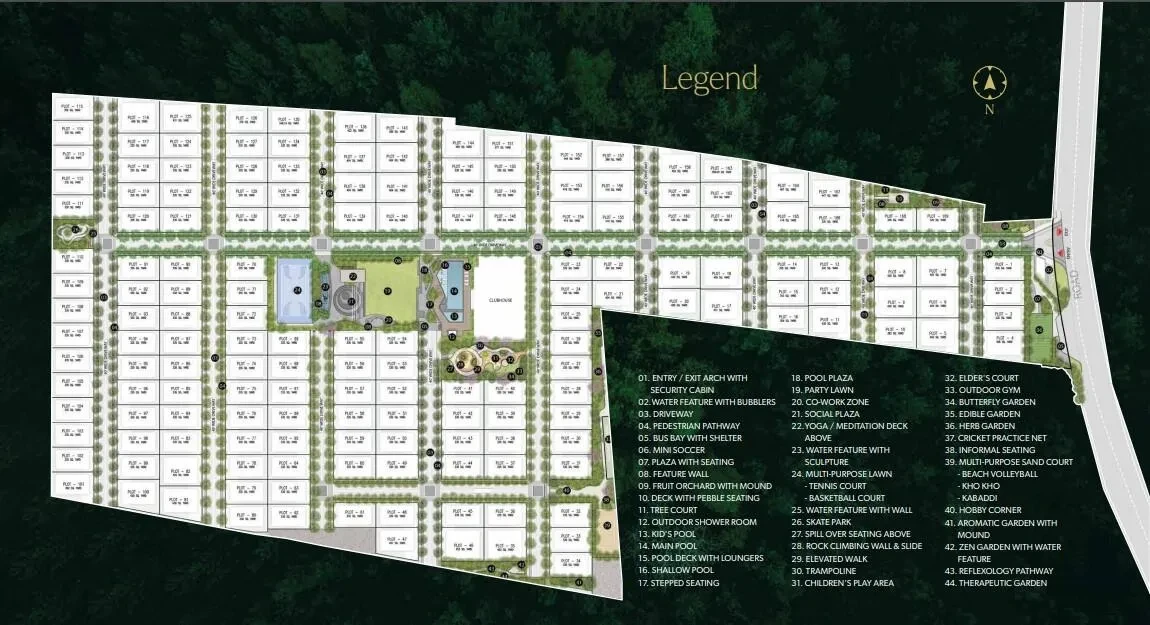Clubhouse: A massive 28,500 sq. ft. G+3 facility featuring a gym, spa, yoga deck, mini-bowling alley, and activity rooms.