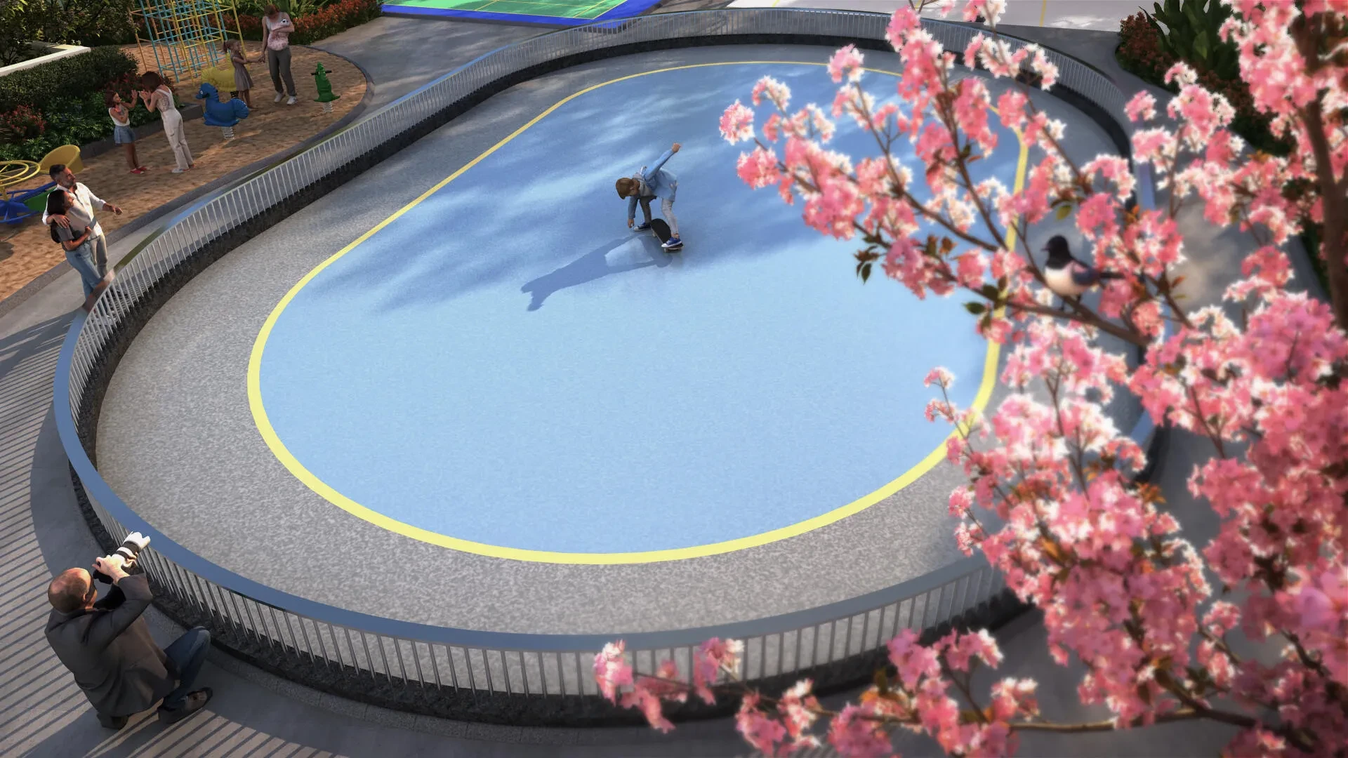 Sports: Badminton and basketball courts, a skating rink, and wall climbing.