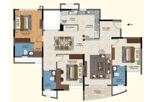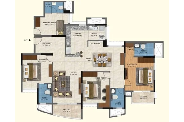 Common area: Granite/ Vitrified flooring (Ground floor Entrance & Lift lobbies), Vitrified tile (Basement lift lobby, Upper floor lift lobbies, Corridors), Lift jamb: Granite / Tiles, Staircase: Step tile. Apartment: Vitrified Tiles (Foyer, Living & Dining, Other Bedrooms, Kitchen), Wooden Flooring (Master bedroom), Antiskid ceramic tiles (Balcony). Cladding: ceramic tiles (Kitchen dado), Ceramic tile dado up to false ceiling height (Toilet dado).