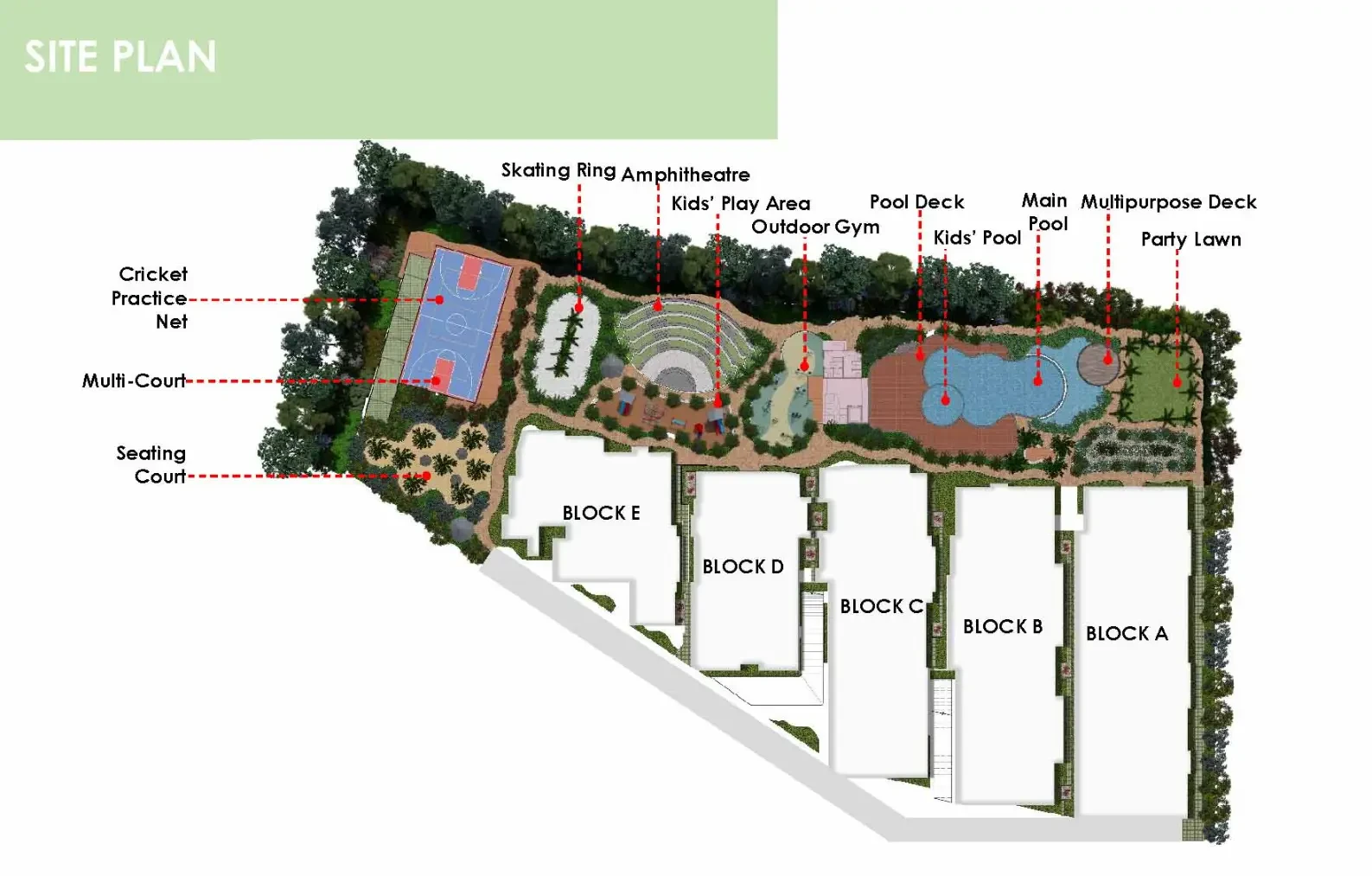 Social & Leisure: Amphitheatre, party hall, yoga zone, and dedicated seating plazas.