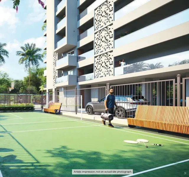 The development spans approximately 2 acres and features two high-rise towers (B+G+14 floors) housing a total of 204 to 208 units. It is designed to offer a gated community environment with roughly 70% open space.