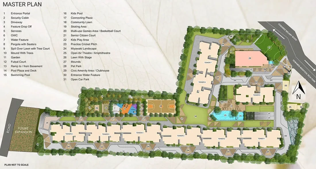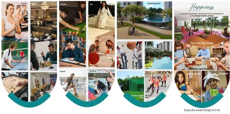 The project features a 50,000 sq. ft. clubhouse known as the "Happiness Club," offering over 30 modern amenities:
