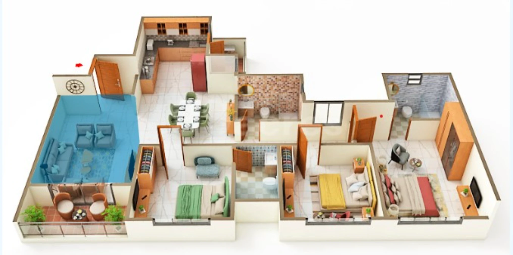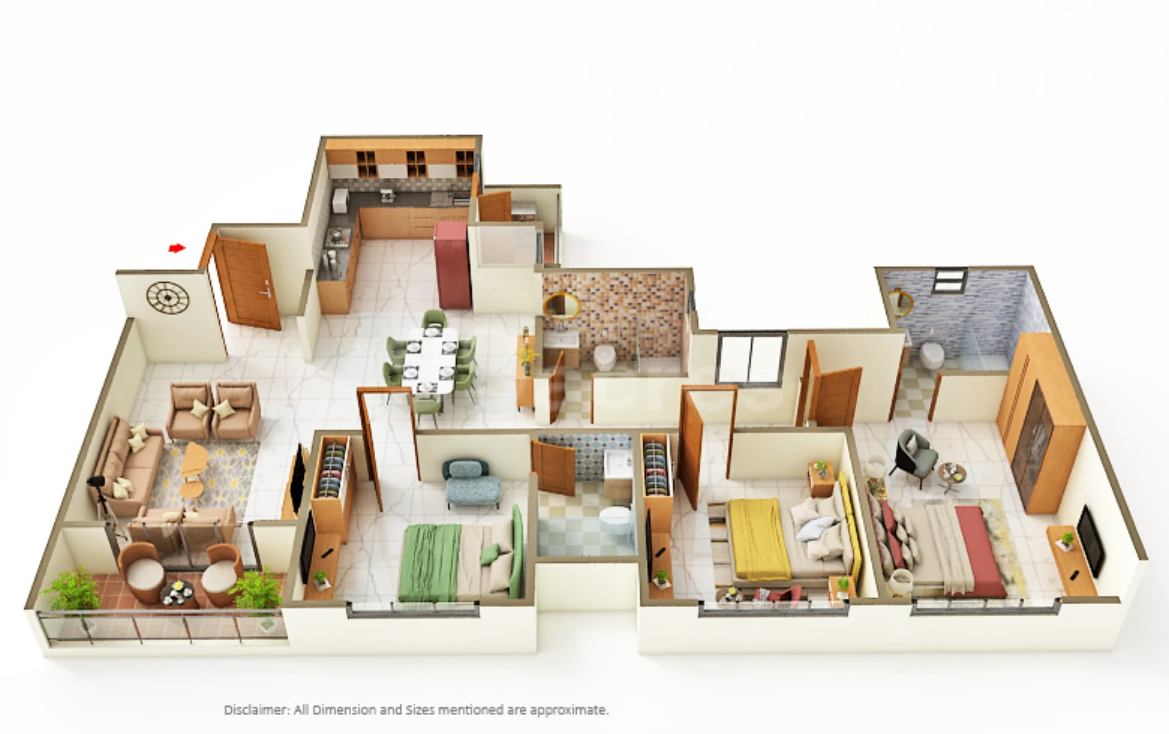 - Living/Dining/Kitchen: Vitrified tiles or high-quality marble.