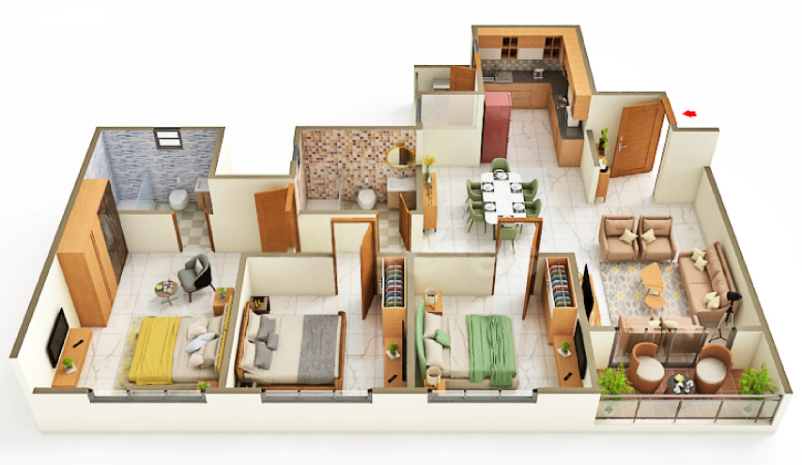 - Main Door: 8-foot tall Vaastu-compliant entry with a timber frame and laminated flush shutter.