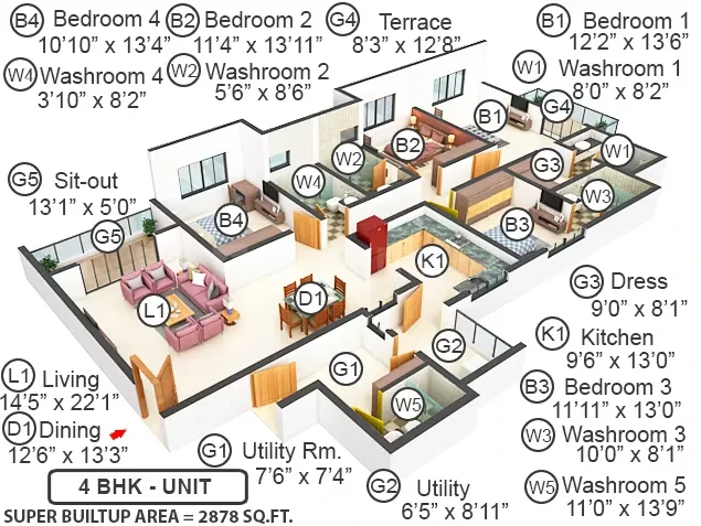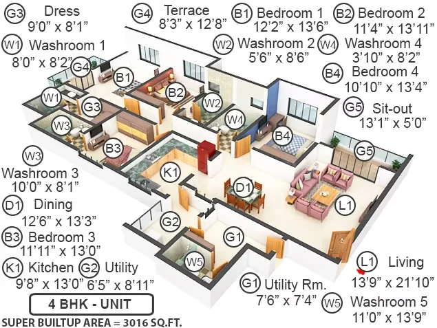 4 BHK: ~2,879 to 3,016 sq. ft (super built-up area).