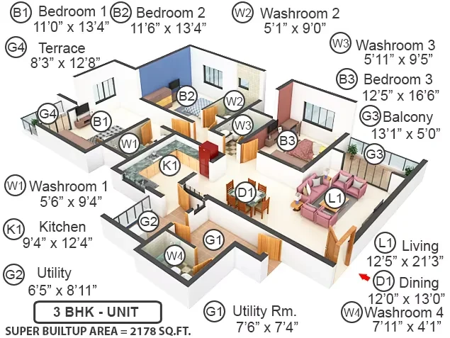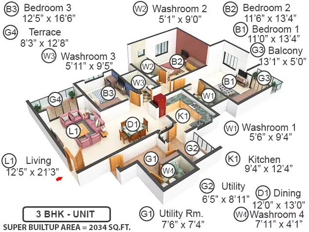 3 BHK: ~2,035 to 2,179 sq. ft (super built-up area).