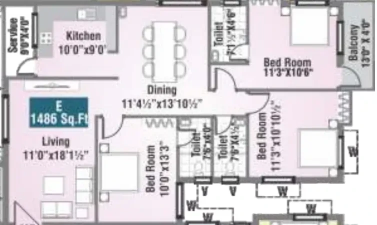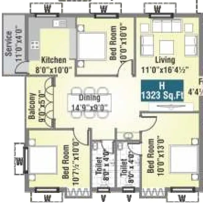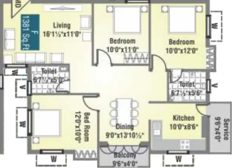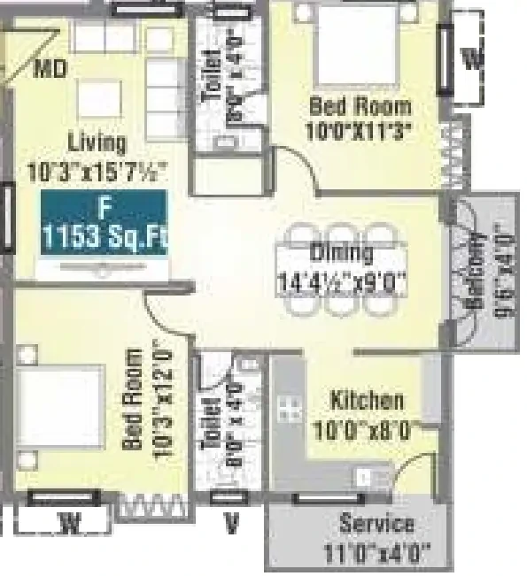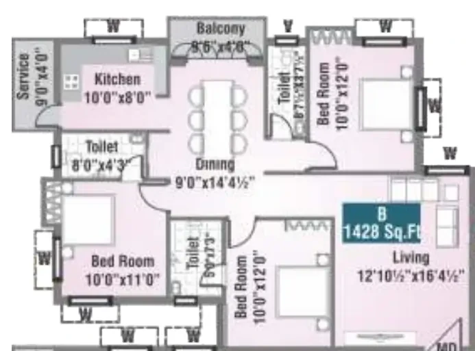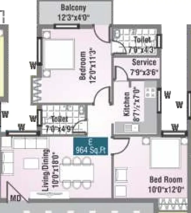 - Teak wood frames and water proof doors shall be provided for balcony, service and toilets.
