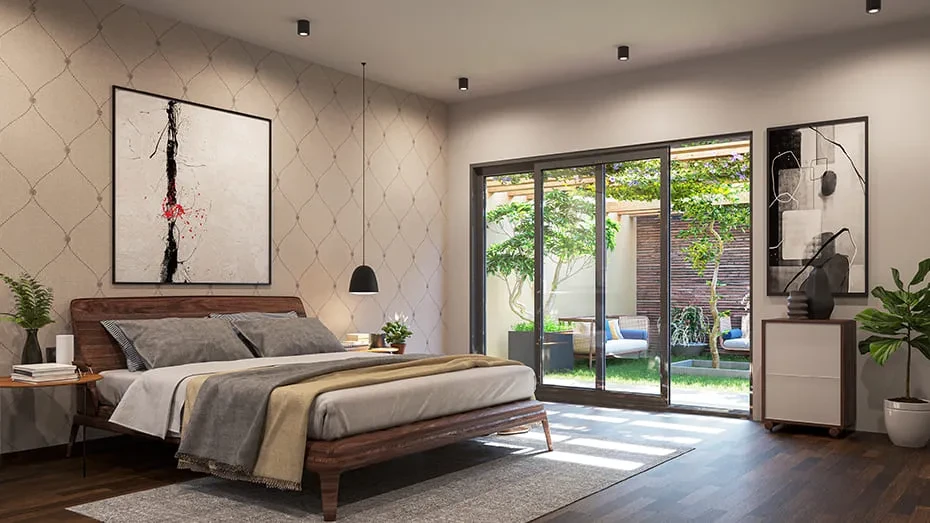 Designed engineered teak wood polished frames with necessary architrave and paneled shutters. Solid engineered country wood frames with necessary architrave with Teak veneered Flush door stained & Polished. Solid engineered country wood frames with necessary architrave with one side Teak veneered & other side Laminated Flush door stained & Polished. All windows shall be UPVC sliding type with mosquito net and plain glazed panels protected with MS grills. Hall: Aluminum sliding type French window with Clear glazing panels. Bed room: UPVC sliding type French window with sliding mosquito net.
