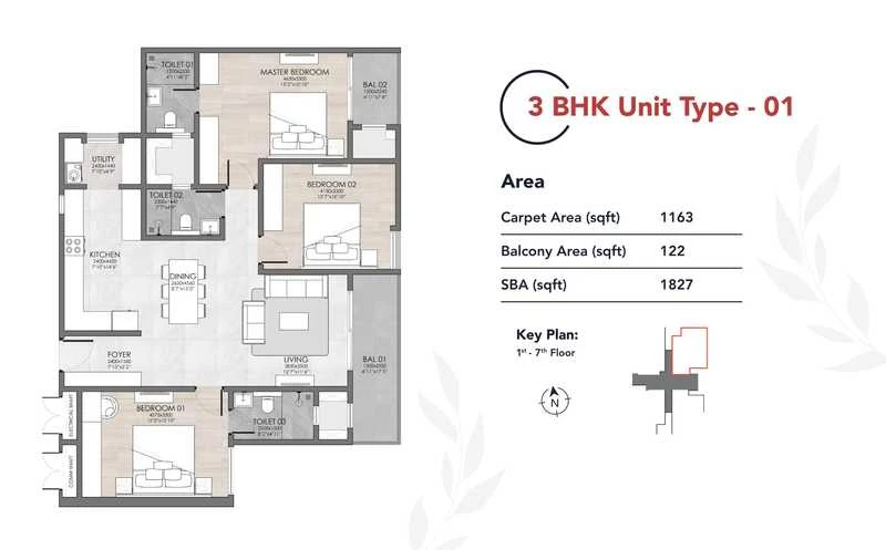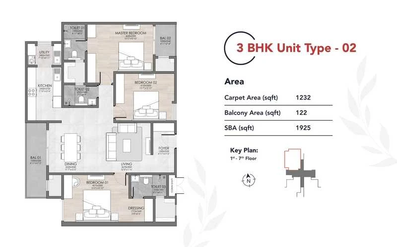 Dimensions: 3 BHK units range from 1,601 to 1,939 sq. ft., while 4 BHK penthouses range from 3,104 to 3,573 sq. ft..