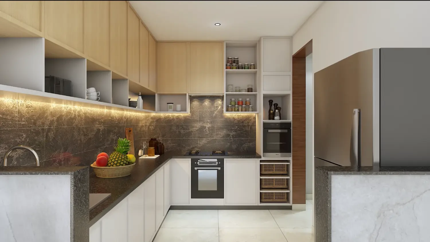 Kitchen: First quality Ceramic wall tile of size 300 x 450mm for a height of 600mm above the counter top finished level