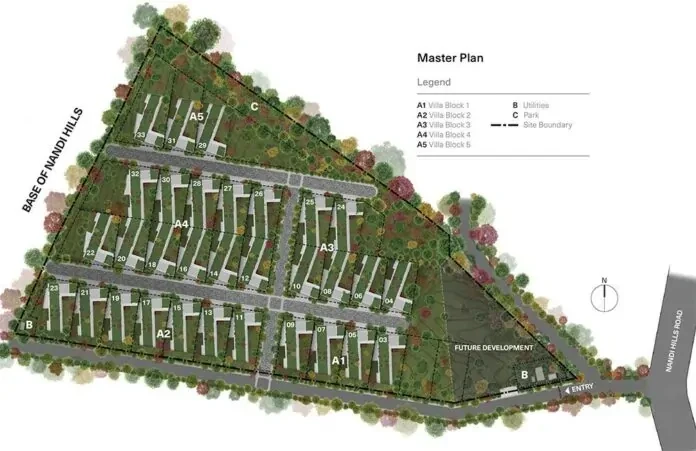 The villas are characterized by earth-sheltered stepped architecture, a hallmark of Total Environment’s design ethos. By integrating the homes into the natural slope of the land, the architecture not only enhances energy efficiency and thermal comfort but also minimizes environmental impact. This terrain-sensitive approach is further amplified by biophilic design principles, ensuring that every corner of the home is filled with natural light, fresh air, and calming views of greenery. Features such as two private gardens per villa, rainwater harvesting systems, tertiary sewage treatment plants, and landscaped internal roads reflect the builder’s commitment to creating Luxury Villas Nandi Hills Bangalore that embrace both modernity and nature.