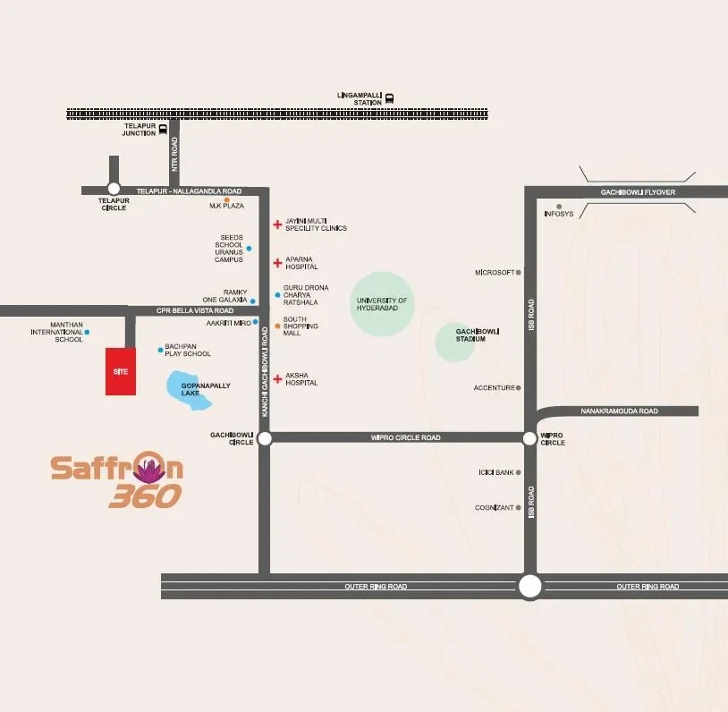 - Key Features: Trishala Saffron 360 in Nallagandla spans of 2.16 acres and comprises 396 well-planned Units within a structures community layout.