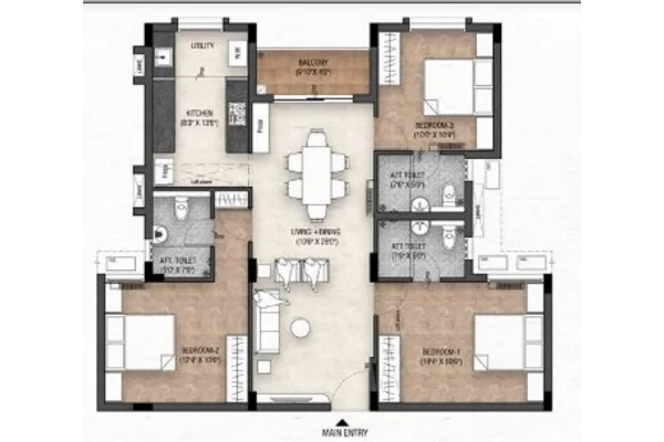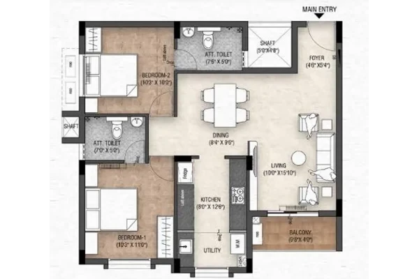 STRUCTURE R. C. C. framed structure Solid concrete block/Fly Ash/Aerocon Walls FLOOR FINISHES General flooring - 2x2 High quality tiles in all areas DOORS Solid Wood frames with factory made doors Laminate finish for main door and painted finish for all other doors Water-resistant doors for bathrooms WINDOWS UPVC sliding windows and MS grills ELECTRICAL Concealed wiring with modular switches PAINTING 2 coats putty, 1 coat primer & 2 coats Premium Emulsion KITCHEN AND UTILITY 2 feet Dado tiles above counter slab Counter slab with Granite as per working drawing Single bowl SS sink and tap in utility area Washing machine provision in utility area BATHROOMS Wall tiles upto 7 feet & anti-skid tiles on the floor C.P. and sanitary fittings from reputed brands POWER BACKUP 600W for 2 & 2.5 BHK and 800W for 3 BHK