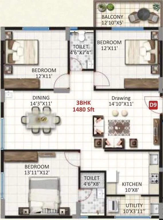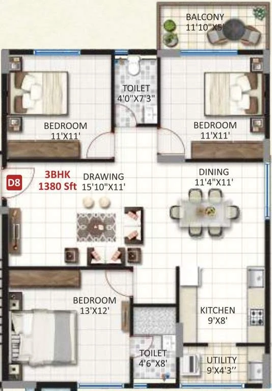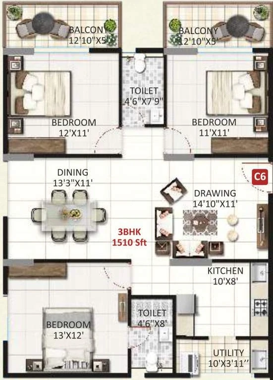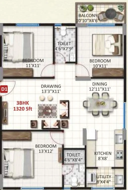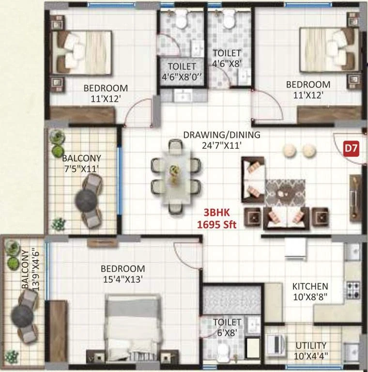 Balconies/Common Areas: Anti-skid tiles in balconies and utility areas; granite/vitrified tiles in lobbies and stairs.