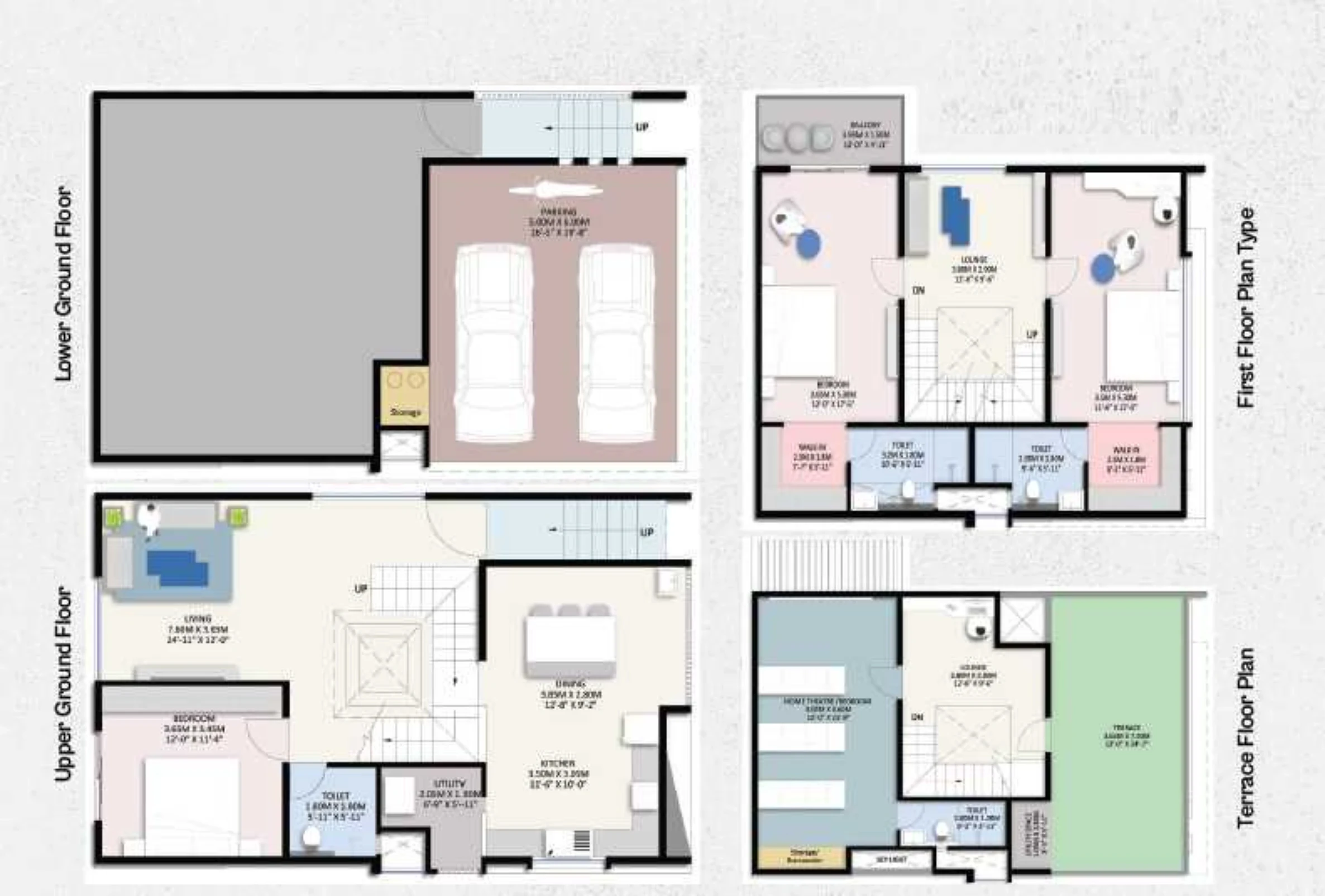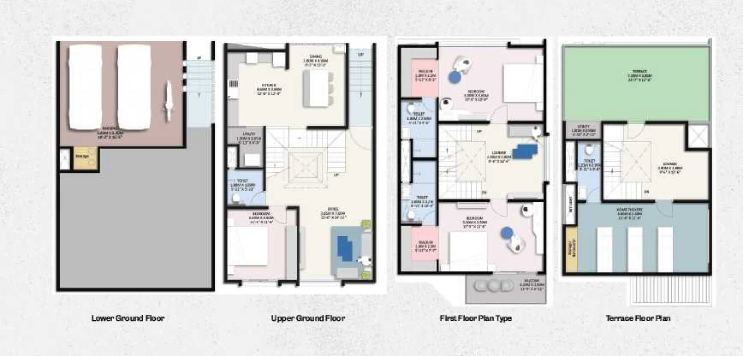 Flooring • Living, drawing, lobby, children, and guest rooms feature premium vitrified tiles. • Master bedrooms are finished with wooden flooring for a luxury feel. • Bathrooms, balconies, and parking areas use premium vitrified tiles or stone. • Staircase areas are finished with high-quality marble or granite materials.