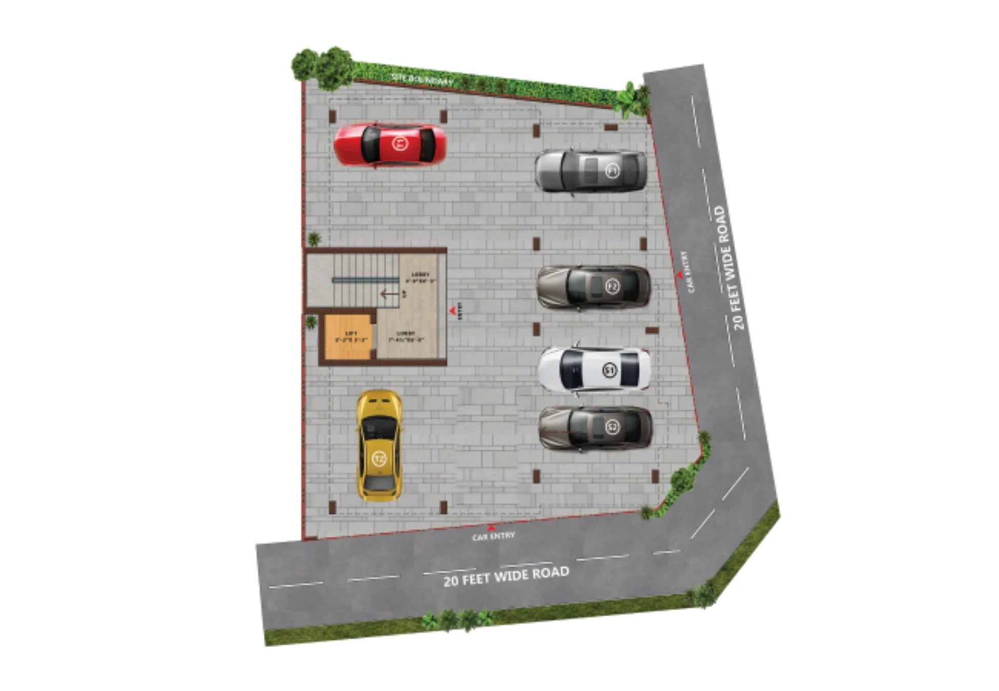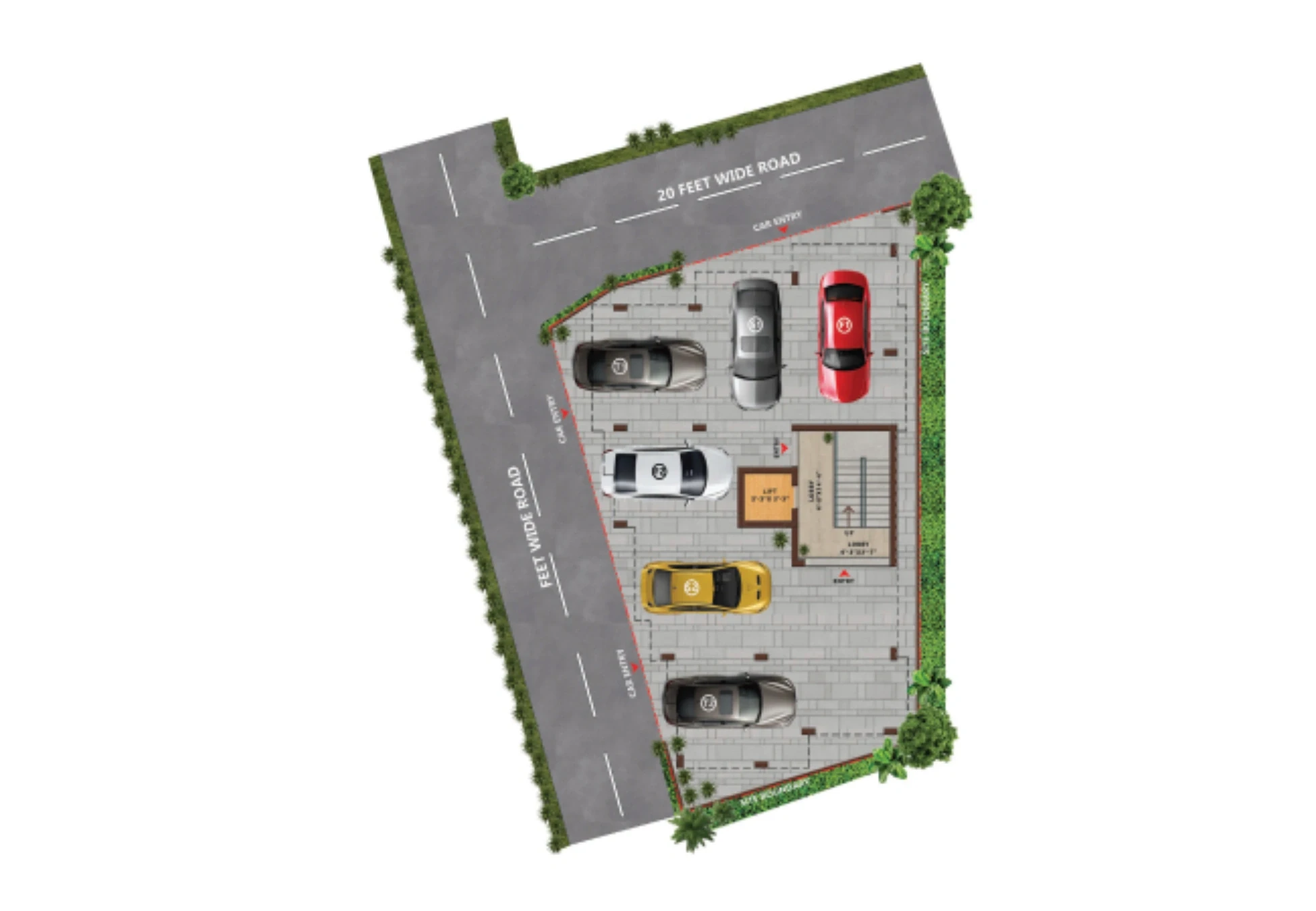 - Exterior: Flood-proof design and covered car parking for each block.