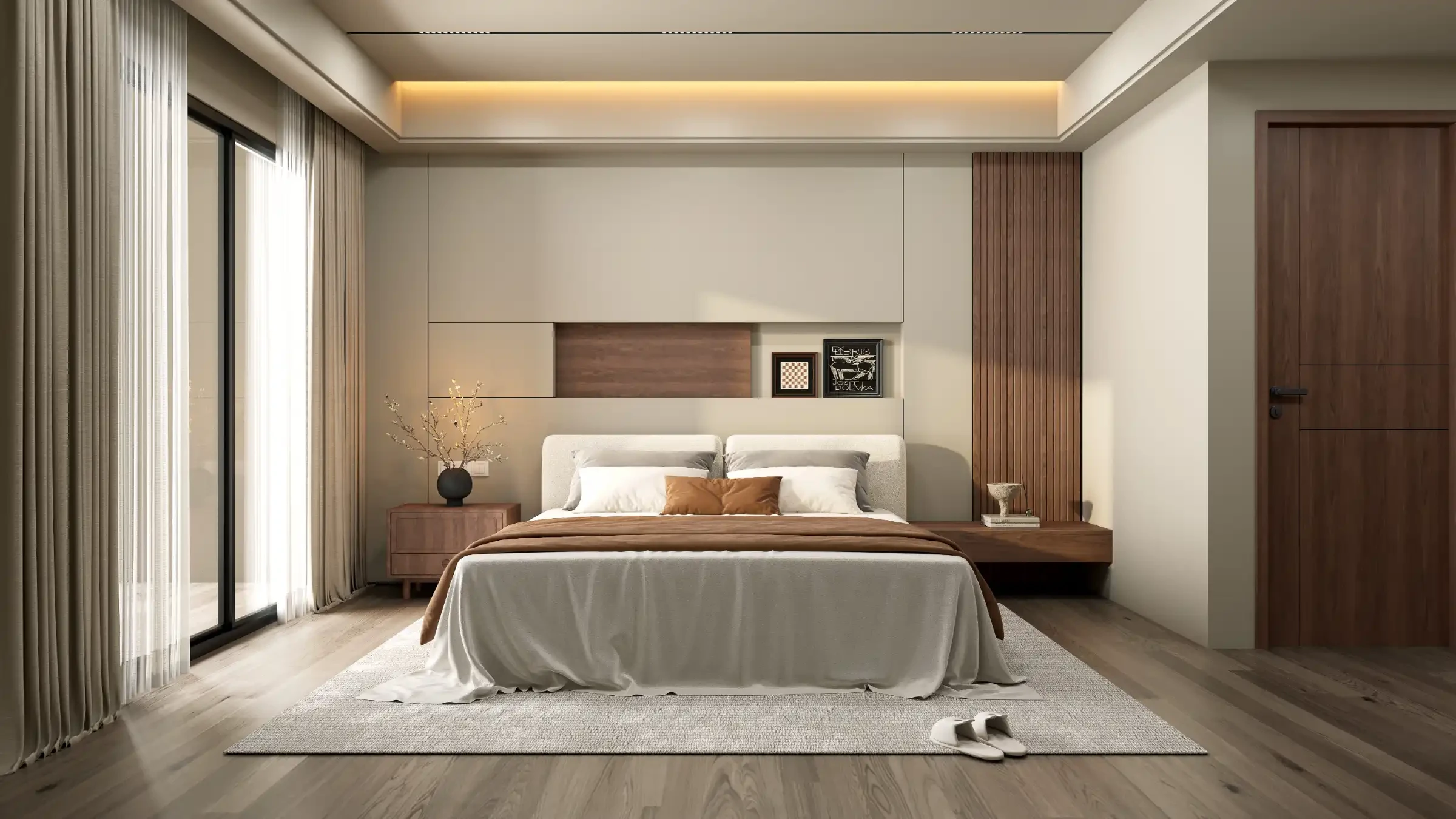 MASTER BEDROOM: Engineered wooden tile flooring.