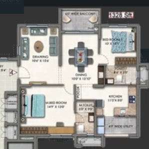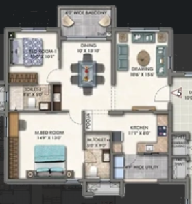 800 x 800 mm size double charged vitrified tiles of Vitero or equivalent make in Drawing, Living, Dining, Pooja, all Bedrooms, and Kitchen. Marble/tile flooring with designer false ceiling in Entrance Lounge. Acid-resistant, anti-skid ceramic tiles of reputed make in Bathrooms. Vitrified tiles of reputed make in Corridors. Rustic ceramic tiles of reputed make with granite sill at the bottom of the railing in all Balconies and Utility areas. Tandoor/Kota stone for Staircase.