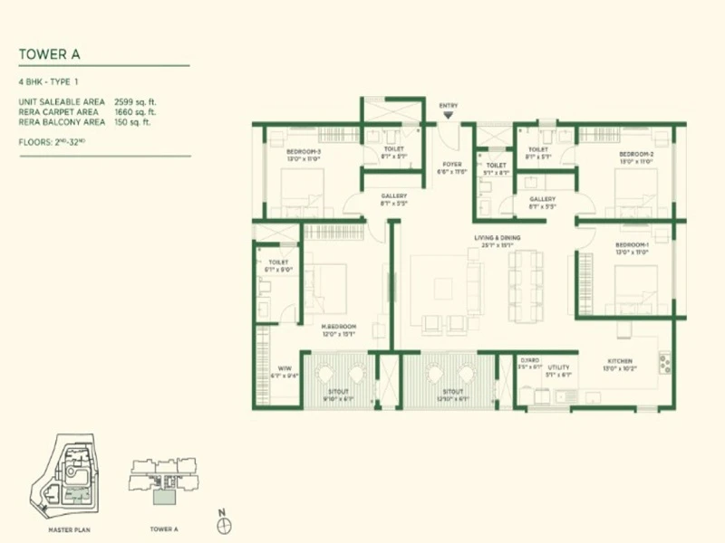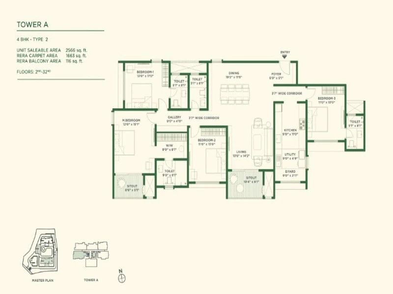 - 4 BHK Apartments: Ranging from 2,566 sq. ft. to 2,599 sq. ft..