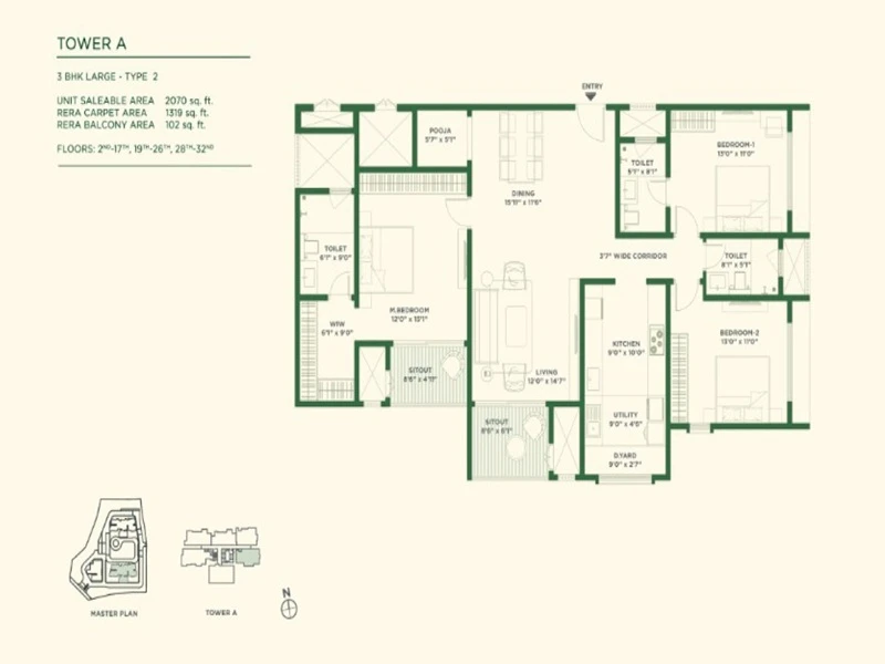 - 3 BHK Apartments: Ranging from 1,870 sq. ft. to 2,070 sq. ft..