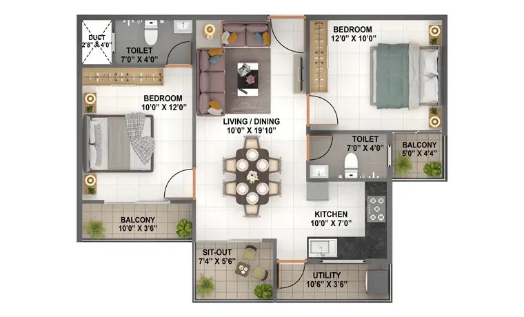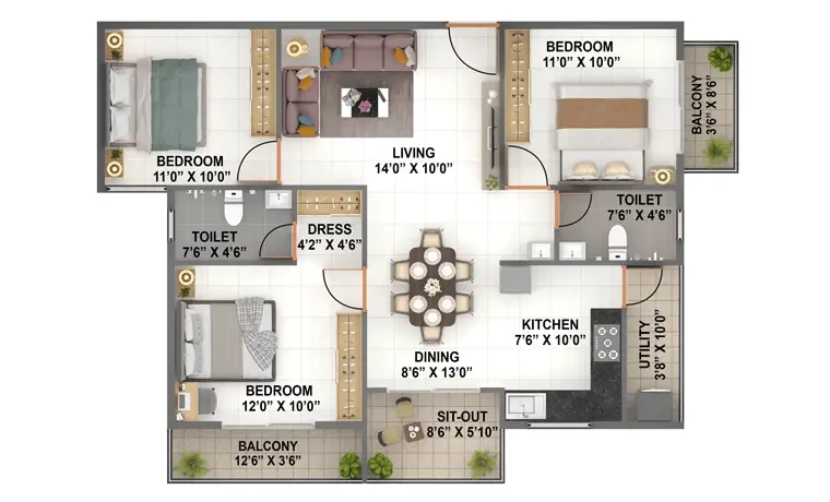 FlooringPolished vitrified tiles with 3" skirting in living, dining, kitchen, and bedrooms; anti-skid ceramic tiles in toilets, balconies, and utilities