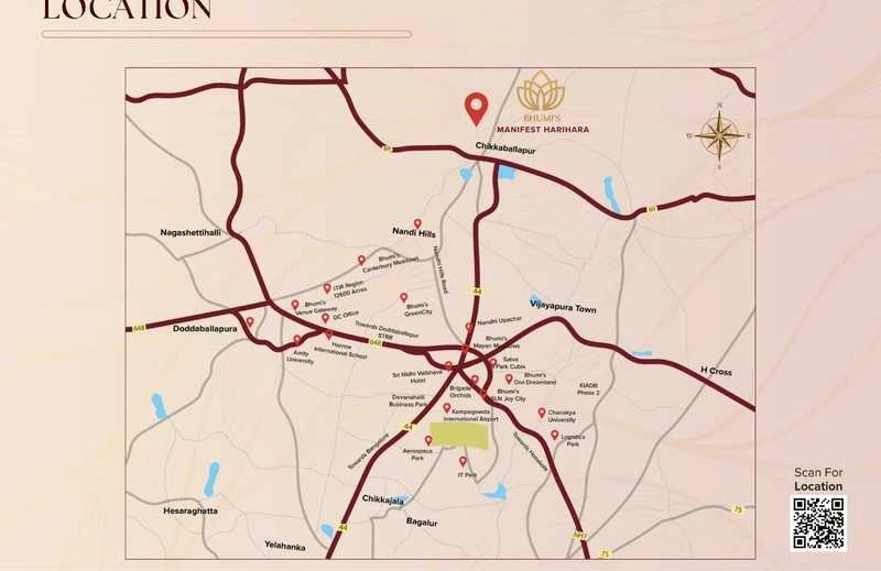 Bhumi's Manifest Harihara is a premium, gated residential township project developed by Bhumi Constructions & Developers. It is located in Chikkaballapur, Bangalore North, strategically positioned off the Bangalore–Hyderabad Highway (NH-44).