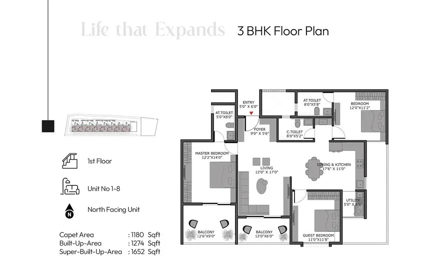 Scale: The project is spread across 2 acres and features a single tower (S+8 floors) with a total of 128 units.