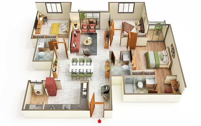 Main Door: Hardwood frame with polished architrave; Flush shutter with both-side polished veneer.