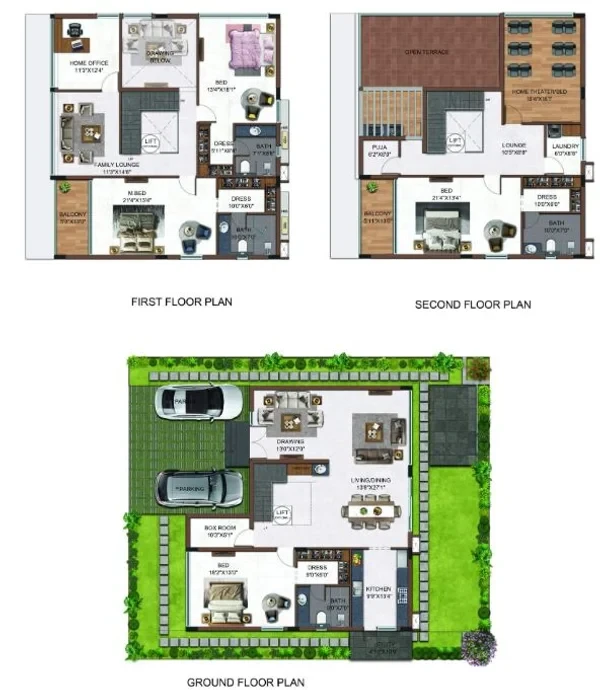 - Every floor has a family space like living, lounge, lobby, open terrace with pergola and barbecue counter