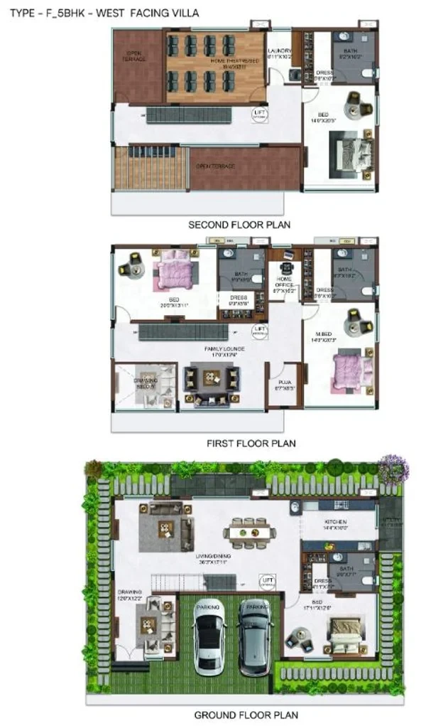 - Villas with 18 to 20 ft wide super-sized bedrooms with walk-in wardrobes and bigger baths of 9′ × 8′
