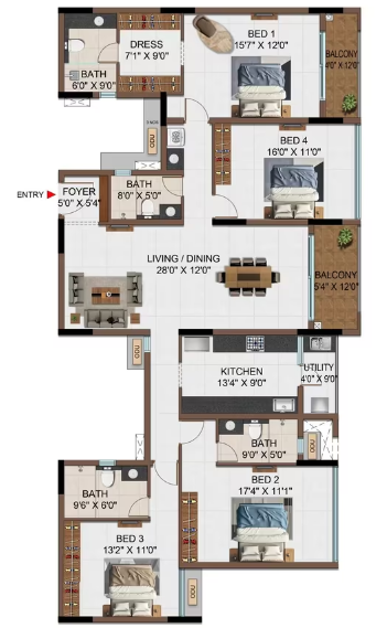 FLOORING Vitrified tiles for foyer, living, dining, internal passage, kitchen, and bedrooms. Anti-skid ceramic tiles in all bathrooms. Wooden-finish vitrified tile flooring in balconies and private open terraces. (Common Areas) Marble flooring at Ground +1 level lobby; granite at other level lobbies. Vitrified tile in all corridor levels. Granite and tile flooring for staircases. Pressed tile flooring on terraces. BATHROOMS ROCA or equivalent CP & sanitary fixtures in all bathrooms. Master Bathroom: Wall-mounted WC with cistern, flush plate, health faucet, single-lever diverter, spout, rain shower, hand shower, granite counter-mounted washbasin, glass partition for shower, tile-flushed shower drain channel. Other Bathrooms: Wall-mounted WC with cistern, flush plate, health faucet, single-lever diverter, overhead shower, spout, granite counter-mounted washbasin, tile square designer drain. Vanity, LED mirror, mirror lights, towel rack, corner shelf, towel ring, exhaust fans, geysers. Pest-free long trench and square SS designer gratings. KITCHEN Kitchen area left open for modular setup with electrical points and plumbing provisions. Provisions for chimney exhaust louvers in the balcony. Cooking hob, chimney, kitchen cabinets. Granite countertop washbasin and granite wall dado in dining area (where applicable). Provision for chimney, hob, dishwasher point (in 4BHK), and aqua guard point. Dining washbasin in most apartments. DOORS AND WINDOWS Main Door: Veneer finish full jamb architrave with double-sided veneer-finish door. Digital lock system (Yale or equivalent). Ironmongery: Lock, tower bolt, designer door handle, door closer, door viewer, magnetic door catcher (Dorset or equivalent). Bedroom Doors: Laminate-finish full jamb architrave with double-sided laminate-finish door. Ironmongery: Lock, designer handle, magnetic door catcher, tower bolt (Dorset or equivalent). Bathroom Doors: Quality frame with double-sided laminate-finish door. Ironmongery: Designer handle, lock (no key), door bush, tower bolt (Dorset or equivalent). Powder-coated aluminum sliding windows with see-through toughened glass and MS grill/railing inside (where applicable). Granite sill coping. French Doors: Powder-coated aluminum frame and doors with toughened glass and safety unlock (where applicable). Ventilators: Powder-coated aluminum frame with fixed/openable shutter for ODU access (where applicable). Common Areas - Terrace Doors: Quality frame with FRP shutters; thumb-turn lock, door closer, tower bolt (Dorset or equivalent). FINISHES Internal Walls & Ceilings: 2 coats of putty, 1 coat of primer, 2 coats of premium emulsion. External Walls: 1 coat of primer, 2 coats of exterior emulsion paint (colors as per architect’s design). Bathrooms: Matt/glossy ceramic wall tiles, primer above false ceiling. Toilet Ceilings: Panel and grid-type false ceiling. Common Areas - Lift Fascia Wall: Marble cladding at Ground +1 level, integrated full-body tile cladding at other levels. ELECTRICAL 3-phase power supply. Safety: MCB & RCCB (Residual Current Circuit Breaker) Switches & Sockets: Modular (Honeywell or equivalent IS-approved brand) Wires: Fire-retardant low smoke (FRLS) copper wire (IS-approved brand) Points: Kitchen: Chimney, hob, dishwasher (in 4BHK), aqua guard Balcony: Weatherproof 5 AMP socket Bedrooms: Foot lamps, USB sockets, 2-way fan points Living & Bedrooms: TV, AC, fan, lights, data points Bathrooms: Geyser points Fans in living & bedrooms; fan with light in dining OTHERS Anti-termite treatment. Shoe rack, TV unit, dining crockery, wardrobes in bedrooms. Curtain channels & rods. Mirrors in dining. Ceiling-mounted cloth drying hanger (living balcony). Hooks in living and balcony. MS handrails as per architectural design for balconies. Granite sill coping for openings. Concealed ODU locations to avoid AC visibility on facade. Designer floor-level unit signage. Well-planned corridors with wall-lit artifacts. BUILDING STRUCTURE RCC-framed structure, seismic-compliant (Zone-3). Masonry: External & internal walls. COMMON AREA SPECIFICATIONS Automatic SS-finish lifts. 100% power backup for clubhouse, lifts, WTP, STP & selective lighting. Apartment name boards on ground floor. MS handrail with enamel paint finish on staircases.