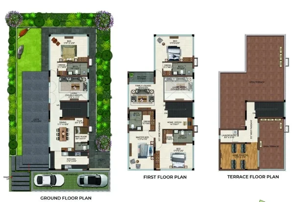 Foyer and lobby areas; Dedicated living rooms, dining areas, and family lounges/living spaces; Kitchens including wet kitchen and luxury kitchen options; Utility areas, separate laundry/utility rooms, laundry and store areas, and laundry/ironing rooms; Various store rooms; Study rooms, home offices, and home office spaces; Multiple bedrooms including guest bedrooms and master bedrooms, each with attached baths/bathrooms/dressing areas where specified; Powder rooms; Puja rooms/pooja rooms; Dedicated home theater rooms; Maid’s room with attached toilet; Various sit-out areas, deck lounges, and sit-out/massage areas.