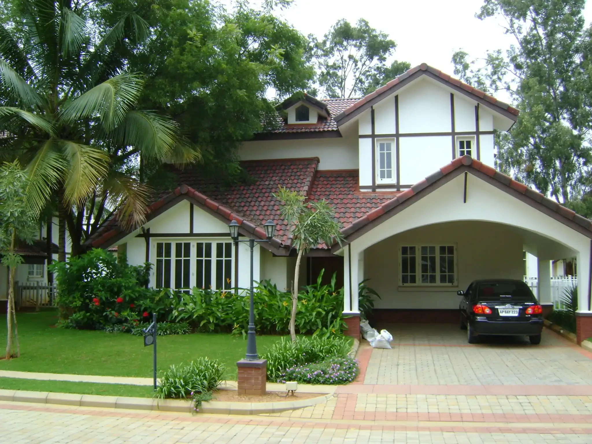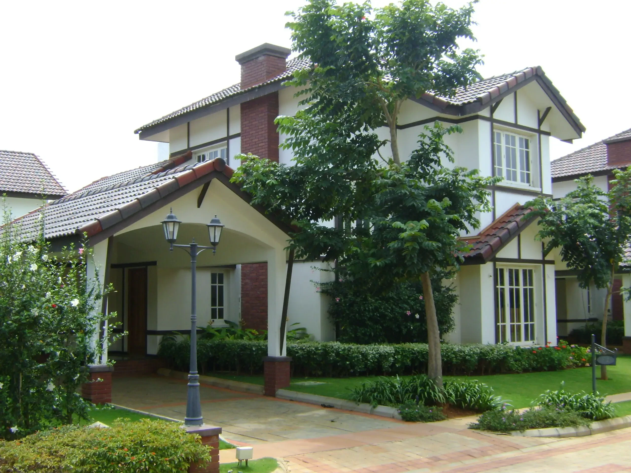 Architectural Style: The villas are designed with unique Tudor aesthetics, featuring elements like white stucco exteriors, ornate half-timbering, and steeply pitched roofs.