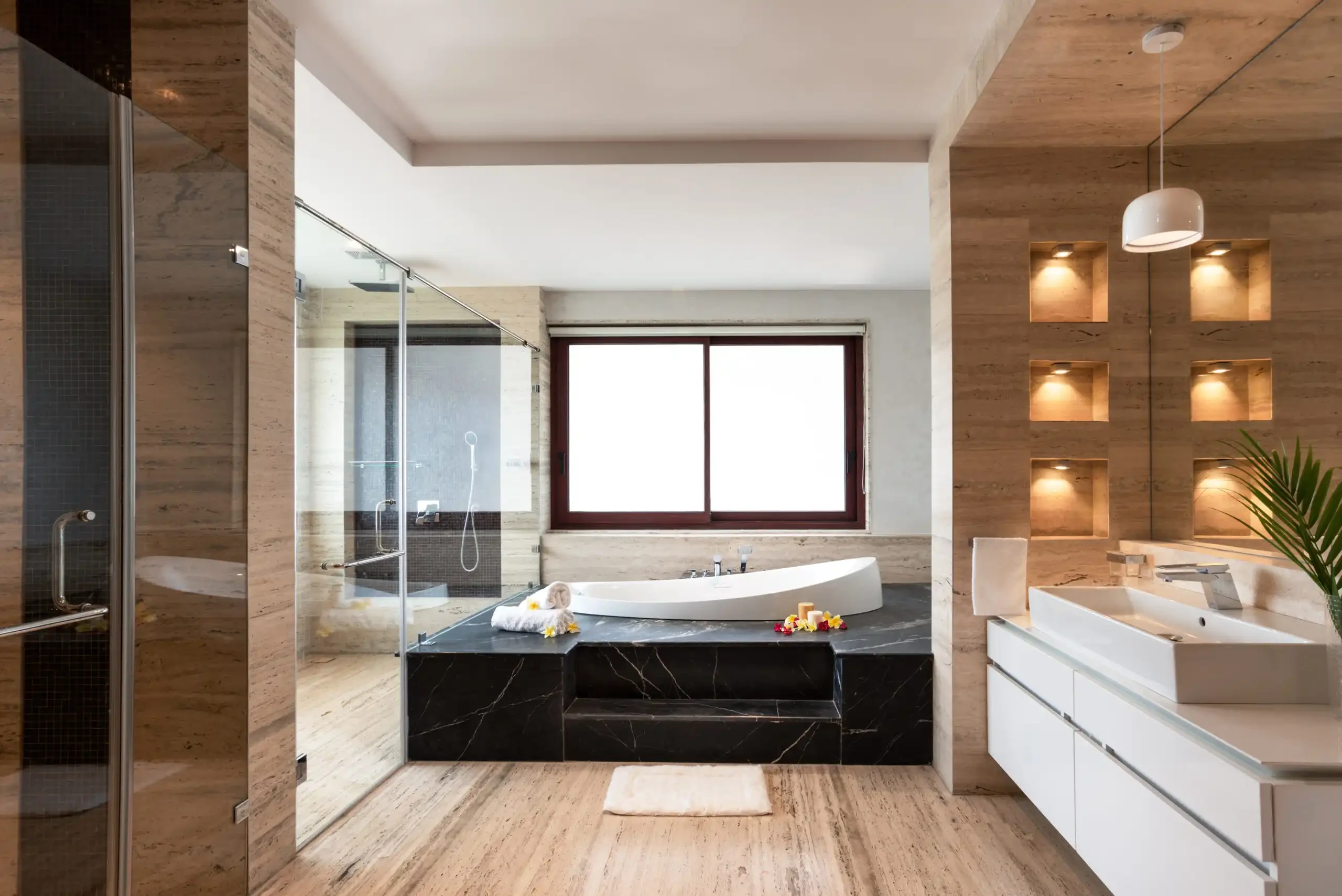 His and her wash basins, his and her EWC, shower with enclosure and bath tub for master bathroom