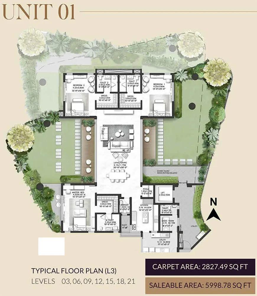 Units: An exclusive community with only 44 units, focusing on privacy and an elite living experience. The units are primarily spacious 3 BHK and 4 BHK configurations, with sizes ranging from approximately 5,998 to 6,677 sq. ft..