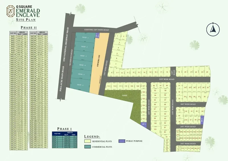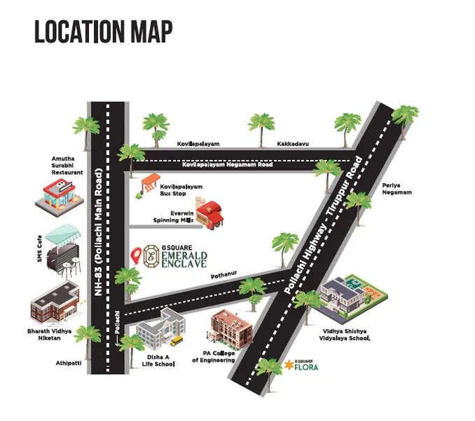 G Square Emerald Enclave is a residential and commercial plotted development by G Square Housing, located bang on the Pollachi-Coimbatore Highway in Pollachi, Coimbatore. The project offers ready-to-construct plots with a range of amenities and is a RERA-approved gated community