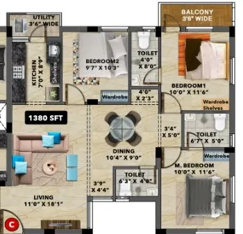 Living/Dining: 2 nos wall light, 1 no chandelier point, 2 no fan points with regulators, 2nos 5A point for TV, 2 nos misc 5A point, 1 no 20A point for fridge/washing machine.