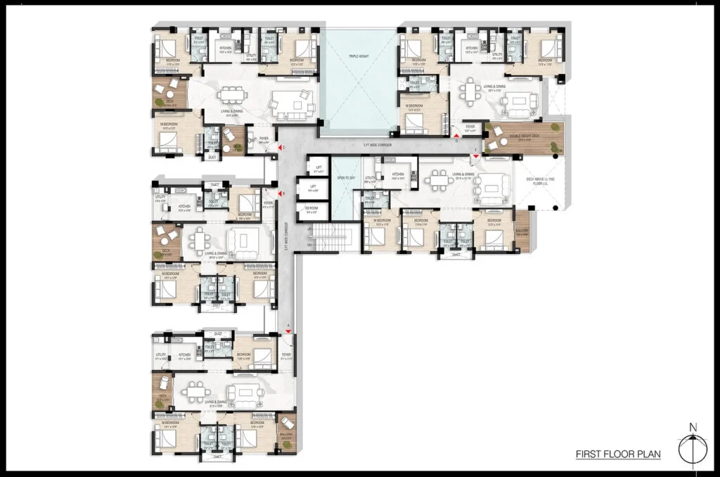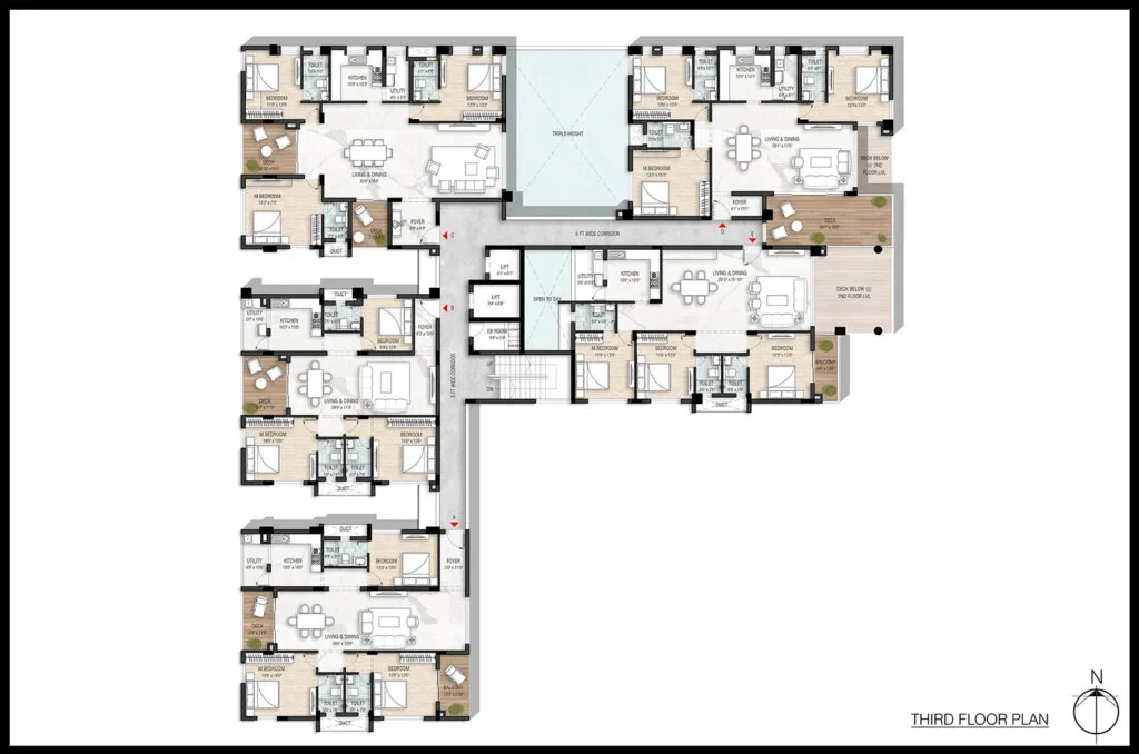 - Cocooned within a single tower with its imposing façade, 19 sprawling 3 BHK apartments are planned across 5 floors and boast of space, ventilation and natural light in abundance.