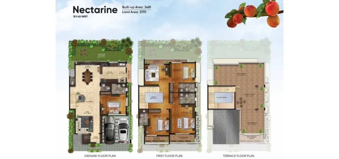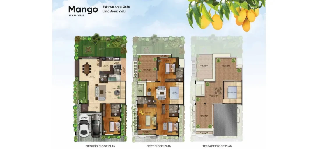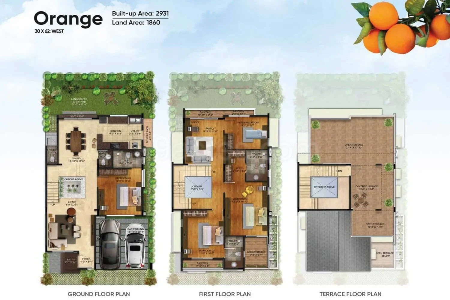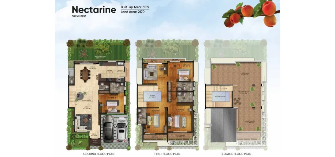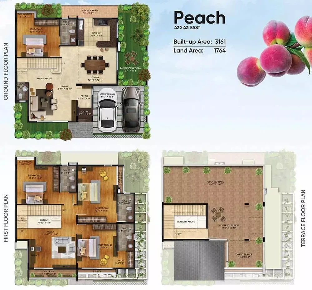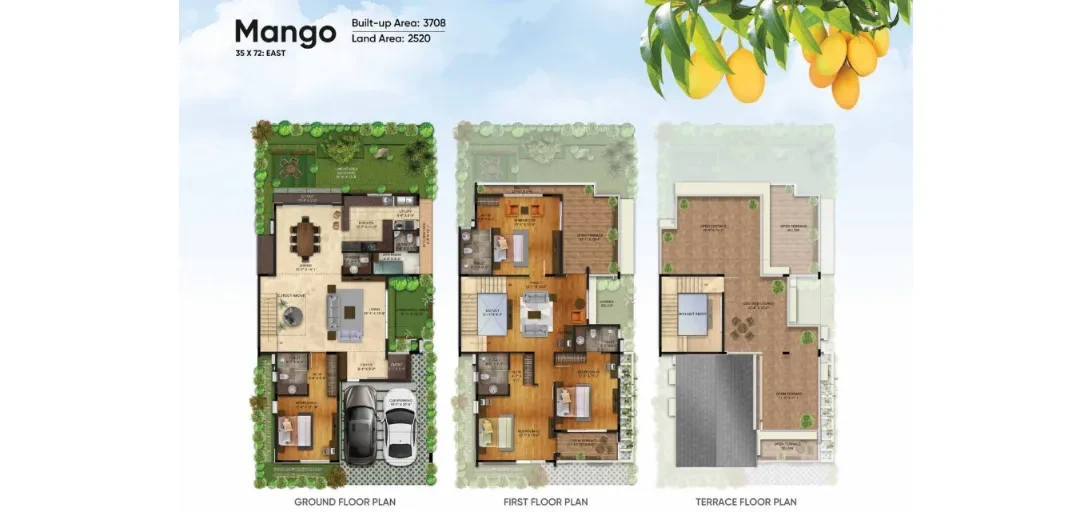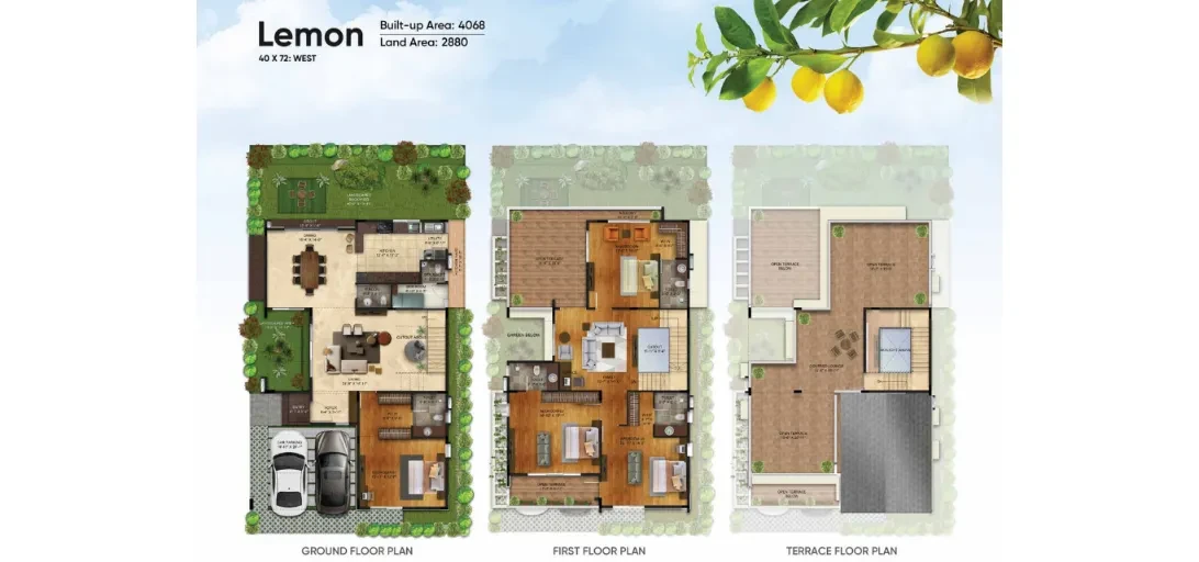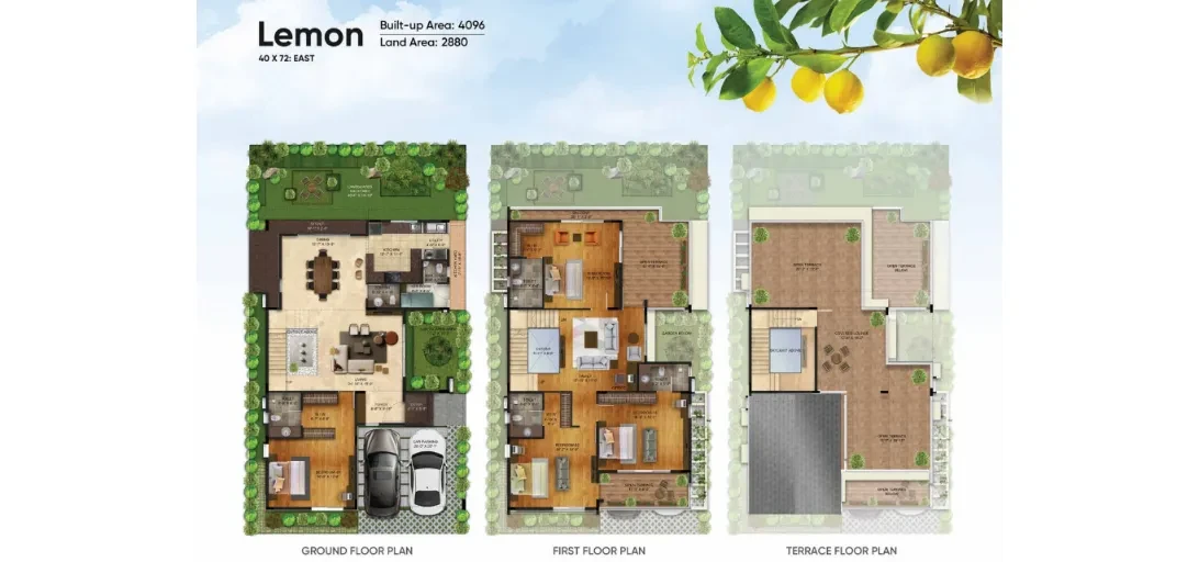 - Built-up Area: Ranging from approximately 2,931 sq. ft. to 4,096 sq. ft. across various villa types (Orange, Peach, Nectarine, Mango, Lemon).