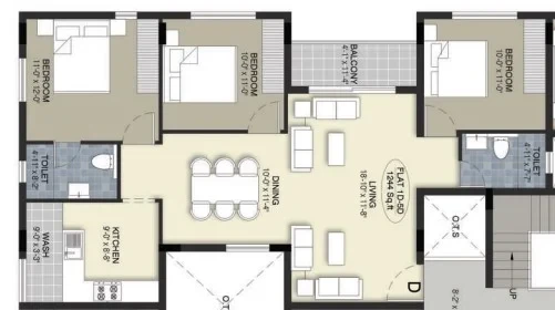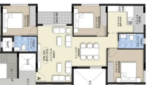 All the units in these flats are configured as 3 BHK units with opulent carpet areas ranging between 1221 - 1244 Sq.Ft. So those with large families can also live comfortably in these homes. Along with modern architecture, these apartments also boast automatic lifts, video door phones, CCTV Camera surveillance, and a solid security system.