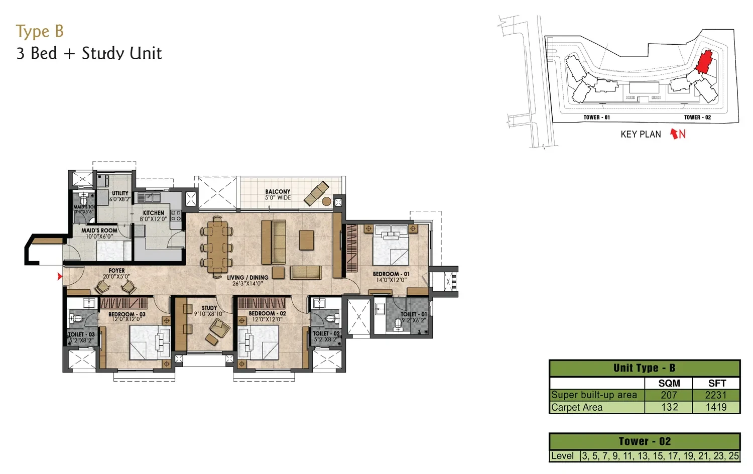 Structure RCC structure, Cement blocks for walls wherever needed Lobby All floor lobbies with flooring and lift cladding in Granite/marble Service lobby, service corridor and staircases in Kota and texture paint on walls Lifts Passenger and service lifts in all blocks of suitable size and capacity Apartment Flooring Quartz/ Engineered Stone in the Foyer, Living, Dining, Corridors, Vitrified tiles in the bedrooms Master Toilets will have Quartz/ Engineered Stone on the floor and walls upto the false ceiling. Other toilets will be done with high quality ceramic tiles. Balconies in ceramic tiles Kitchen Vitrified tile flooring and 2 feet ceramic tile dado over the granite counter. Double bowl, single drain steel sink with single lever tap Servants room and Toilet, Ceramic tile flooring and ceramic tile dado for the maids room, maids toilet and utility Toilets and Fittings Granite for the counters with wah basins and EWC’s. Shower panel in the master toilet, glass partitions in all toilets with high quality chrome plated fittings. Geysers in all toilets All toilets of the last 2 floors will have water from solar panels with provision for geyser in the Master Toilet. Suspended pipeline in all toilets concealed within a false ceiling. Provision for exhaust fan Painting Cement/ Texture paint for the external walls, Emulsion for internal walls and OBD for ceilings. All MS railings with enamel paint Doors and Windows ENTRANCE DOOR - will be done in Timbers INTERNAL DOORS - wooden frames and laminated flush shutters EXTERNAL DOORS - UPVC frames and shutters WINDOWS - 2 track UPVC frames, provision for mosquito mesh shutters Electrical Concelaed wiring with PVC insulated copper wires and modular switches. Sufficient power outlets and light points provided TV and telephone points provided in the living and all bedrooms