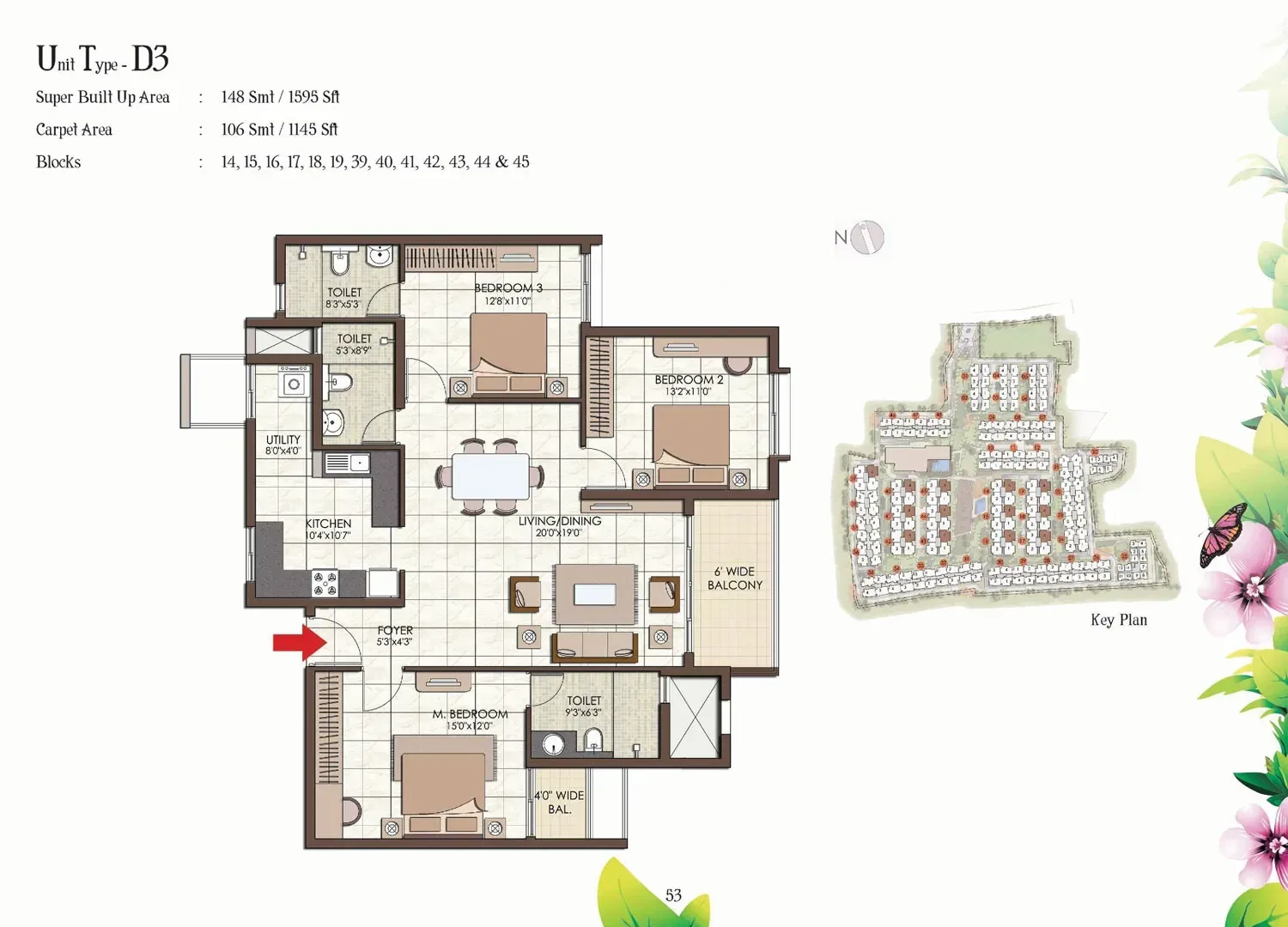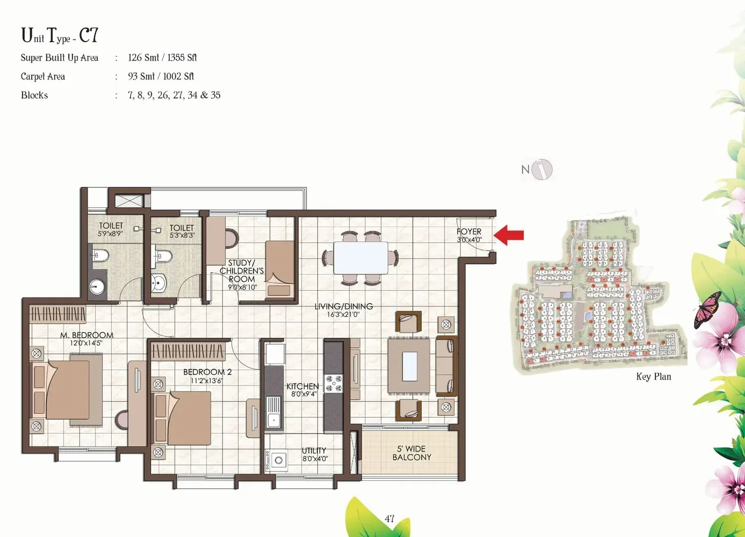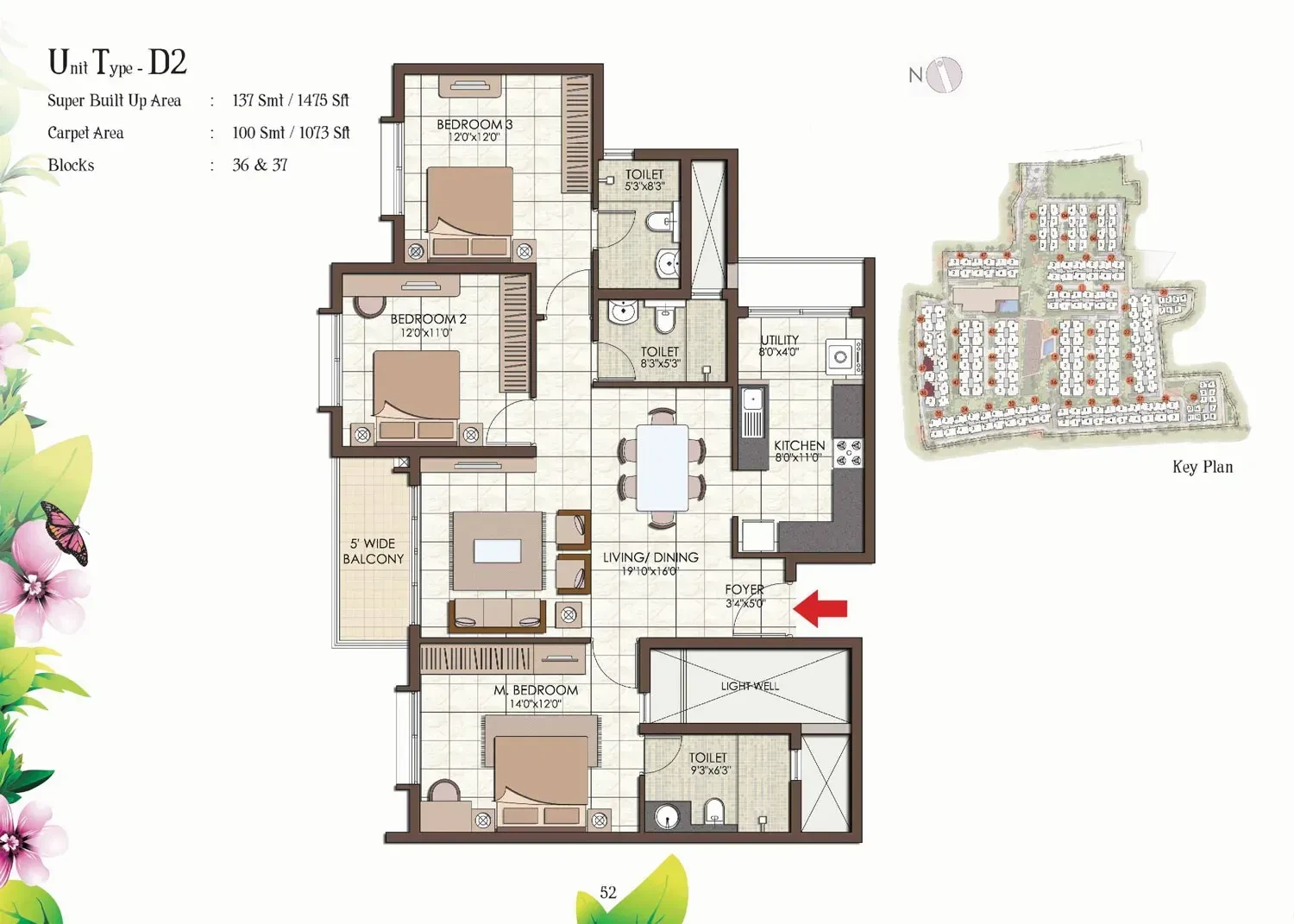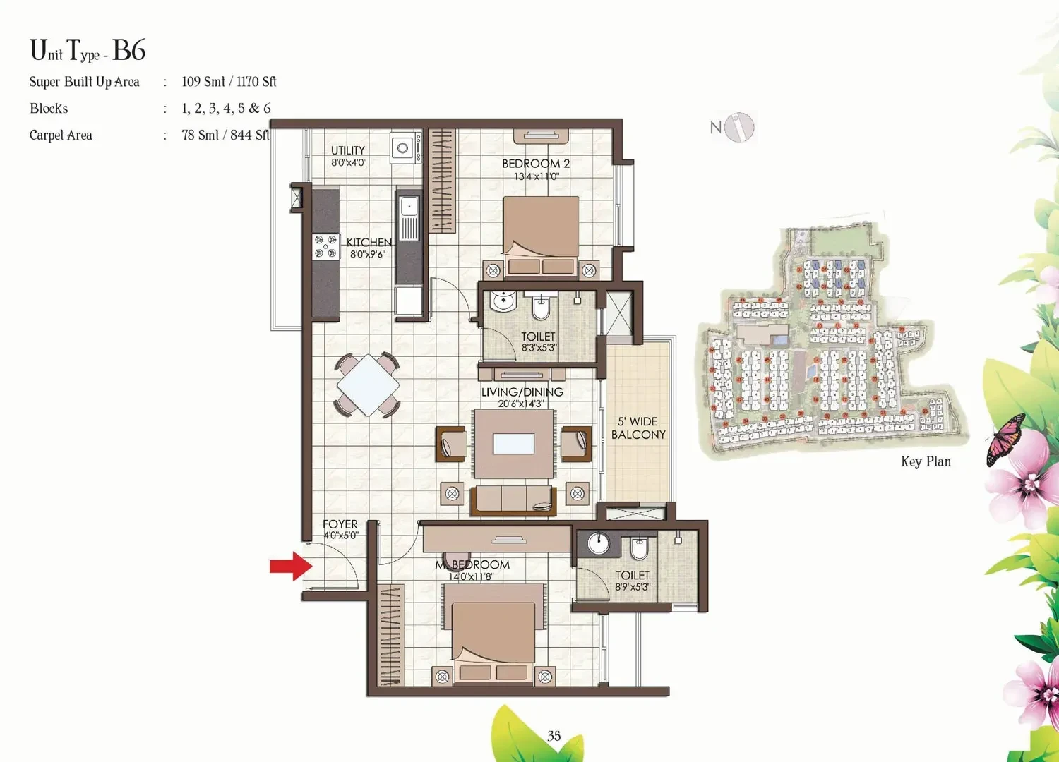 STRUCTURE RCC framed structure Cement blocks for walls LOBBY Elegant ground floor lobby flooring and cladding in marble/granite Upper floors lobby flooring in vitrified tiles and lift cladding in marble/granite All lobby walls in paint/texture paint and ceiling in OBD Service staircase and lobby with OBD on walls and ceilings LIFTS Suitable size and capacity passenger and service lifts in every block FLOORING Vitrified tiles in the foyer, living, dining, corridors and all bedrooms, Antiskid ceramic tiles in balconies KITCHEN Ceramic/vitrified tiled flooring and 2 feet ceramic tile dado over the granite counter Single bowl single drain steel sink with chrome plated tap Ceramic/vitrified tiled flooring and ceramic tile dado for the utility FITTINGS Antiskid ceramic tiles flooring, Ceramic tiles on walls up to false ceilings Granite counter with ceramic wash basin in the master toilet and pedestal wash basins in other toilets European Water Closet (EWCs) and chrome plated fittings, Chrome plated tap with shower mixer Geysers in all toilets Top 2 floors will have solar water heater facility along with geysers in all toilets Suspended pipelines in toilets concealed within the grid false ceiling DOORS AND WINDOWS 8 Feet high opening with premoulded flush shutters and frame in woods 7 Feet high opening with wooden frames and flush shutters UPVC frames and shutters 3Track UPVC framed windows with clear glass and provision only for mosquito mesh shutters MS designer grills, enamel painted for ground floor apartments only PAINTING Cement paint on external walls, OBD on internal walls, Enamel paint on all MS railings ELECTRICAL Concealed wiring with PVC insulated copper wires and modular switches Sufficient power outlets and light points will be provided 2.4 KVA power will be provided for 1 br units 4.0 KVA power will be provided for 2 units 6.4 KVA power will be provided for 3 br units Cable TV and telephone points provided in the living and all bedrooms Provision for installation of spilt AC in the living and all bedrooms ELCB and individual meters will be provided for all apartment