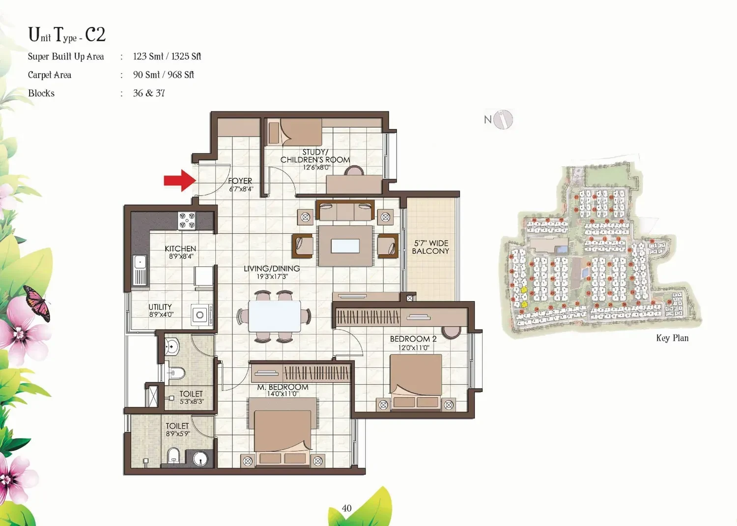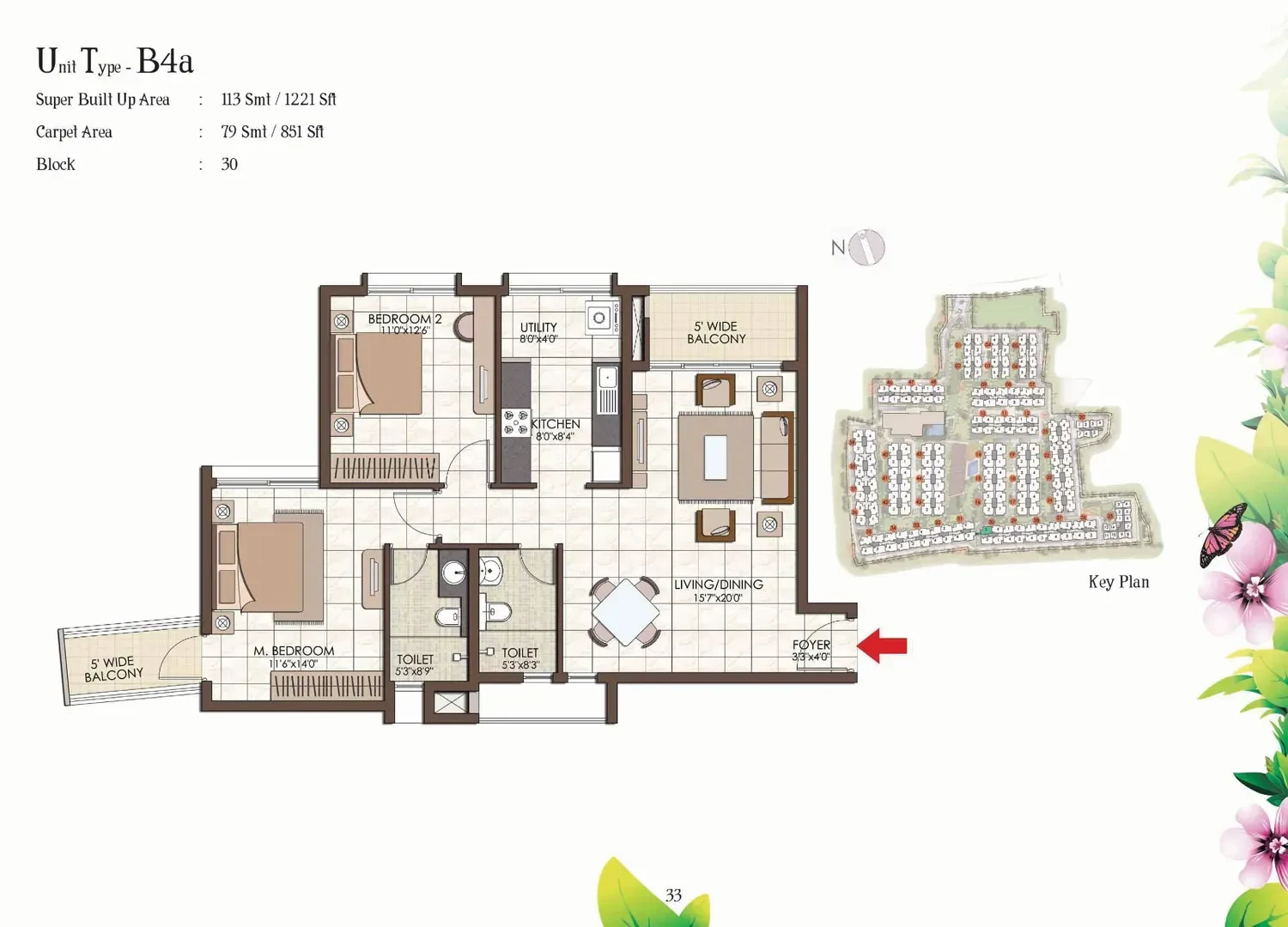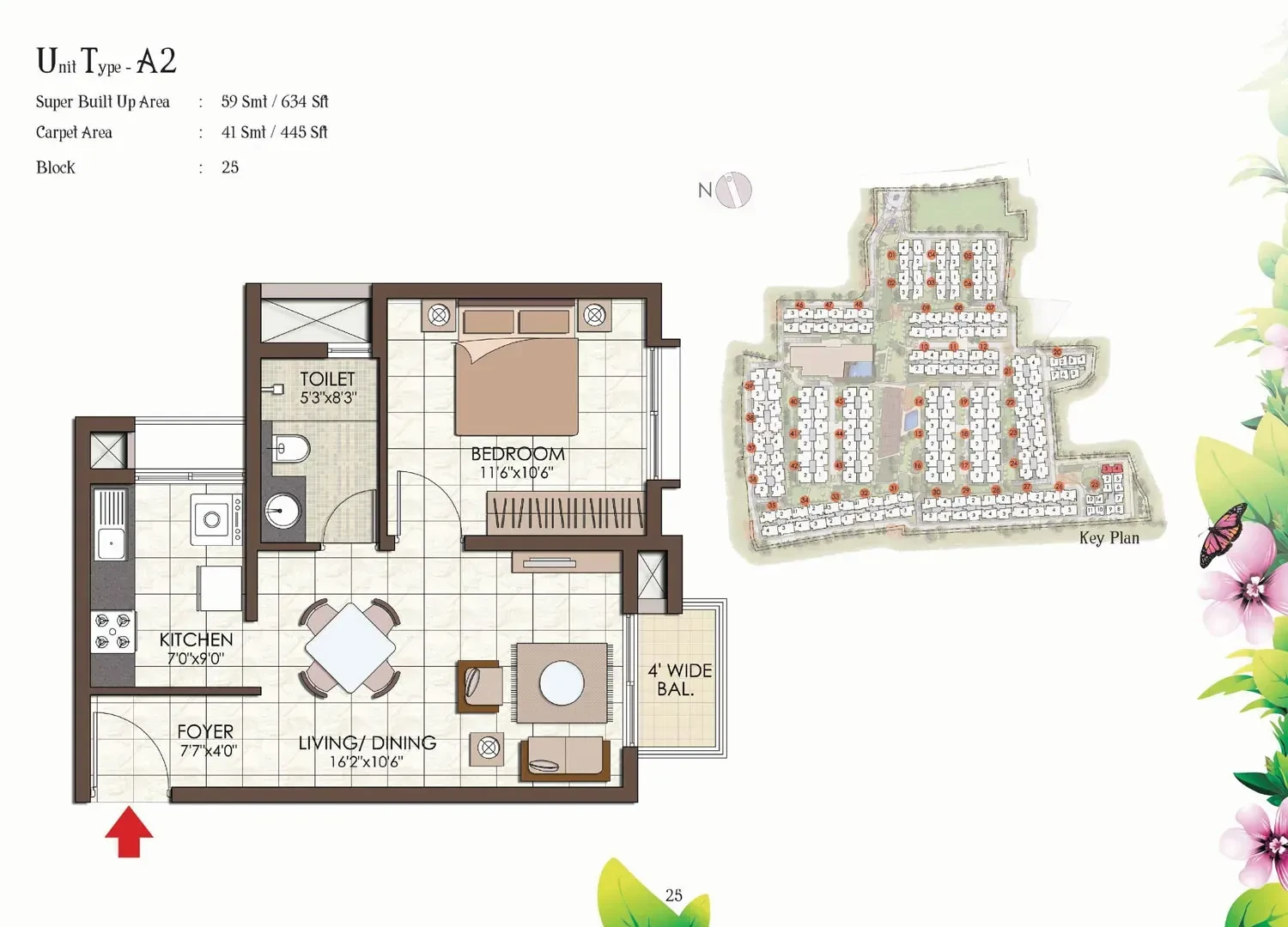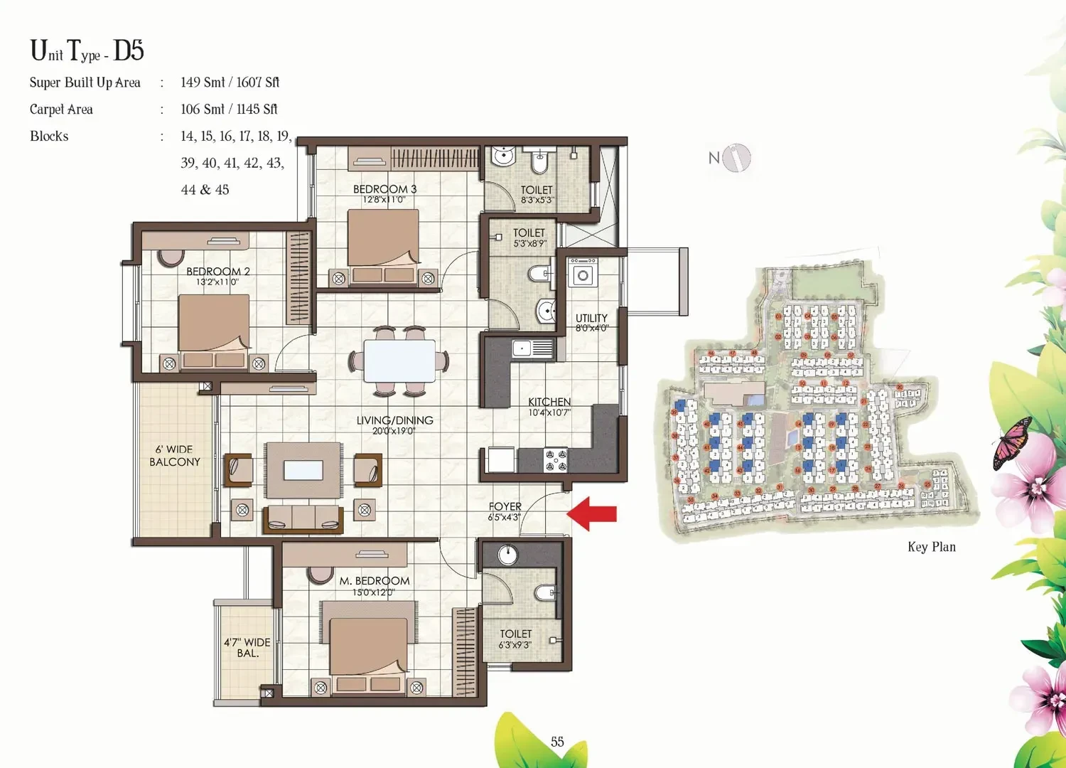 STRUCTURE RCC framed structure Cement blocks for walls LOBBY Elegant ground floor lobby flooring and cladding in marble/granite Upper floors lobby flooring in vitrified tiles and lift cladding in marble/granite All lobby walls in paint/texture paint and ceiling in OBD Service staircase and lobby with OBD on walls and ceilings LIFTS Suitable size and capacity passenger and service lifts in every block FLOORING Vitrified tiles in the foyer, living, dining, corridors and all bedrooms, Antiskid ceramic tiles in balconies KITCHEN Ceramic/vitrified tiled flooring and 2 feet ceramic tile dado over the granite counter Single bowl single drain steel sink with chrome plated tap Ceramic/vitrified tiled flooring and ceramic tile dado for the utility FITTINGS Antiskid ceramic tiles flooring, Ceramic tiles on walls up to false ceilings Granite counter with ceramic wash basin in the master toilet and pedestal wash basins in other toilets European Water Closet (EWCs) and chrome plated fittings, Chrome plated tap with shower mixer Geysers in all toilets Top 2 floors will have solar water heater facility along with geysers in all toilets Suspended pipelines in toilets concealed within the grid false ceiling DOORS AND WINDOWS 8 Feet high opening with premoulded flush shutters and frame in woods 7 Feet high opening with wooden frames and flush shutters UPVC frames and shutters 3Track UPVC framed windows with clear glass and provision only for mosquito mesh shutters MS designer grills, enamel painted for ground floor apartments only PAINTING Cement paint on external walls, OBD on internal walls, Enamel paint on all MS railings ELECTRICAL Concealed wiring with PVC insulated copper wires and modular switches Sufficient power outlets and light points will be provided 2.4 KVA power will be provided for 1 br units 4.0 KVA power will be provided for 2 units 6.4 KVA power will be provided for 3 br units Cable TV and telephone points provided in the living and all bedrooms Provision for installation of spilt AC in the living and all bedrooms ELCB and individual meters will be provided for all apartment