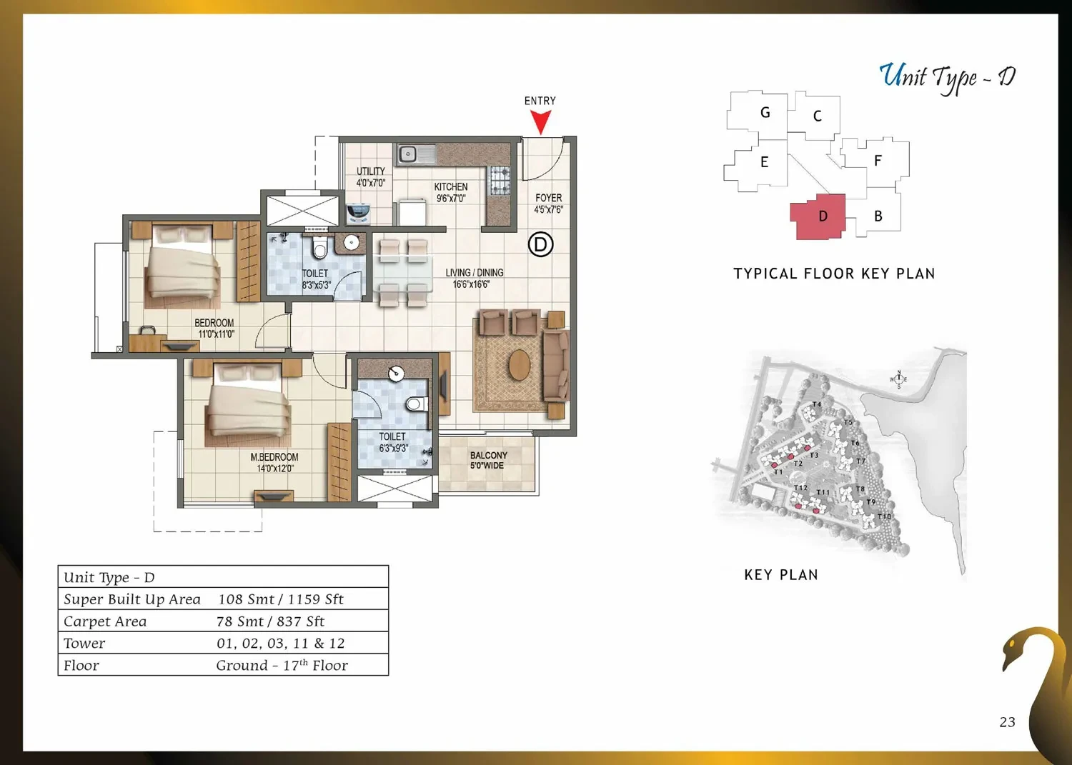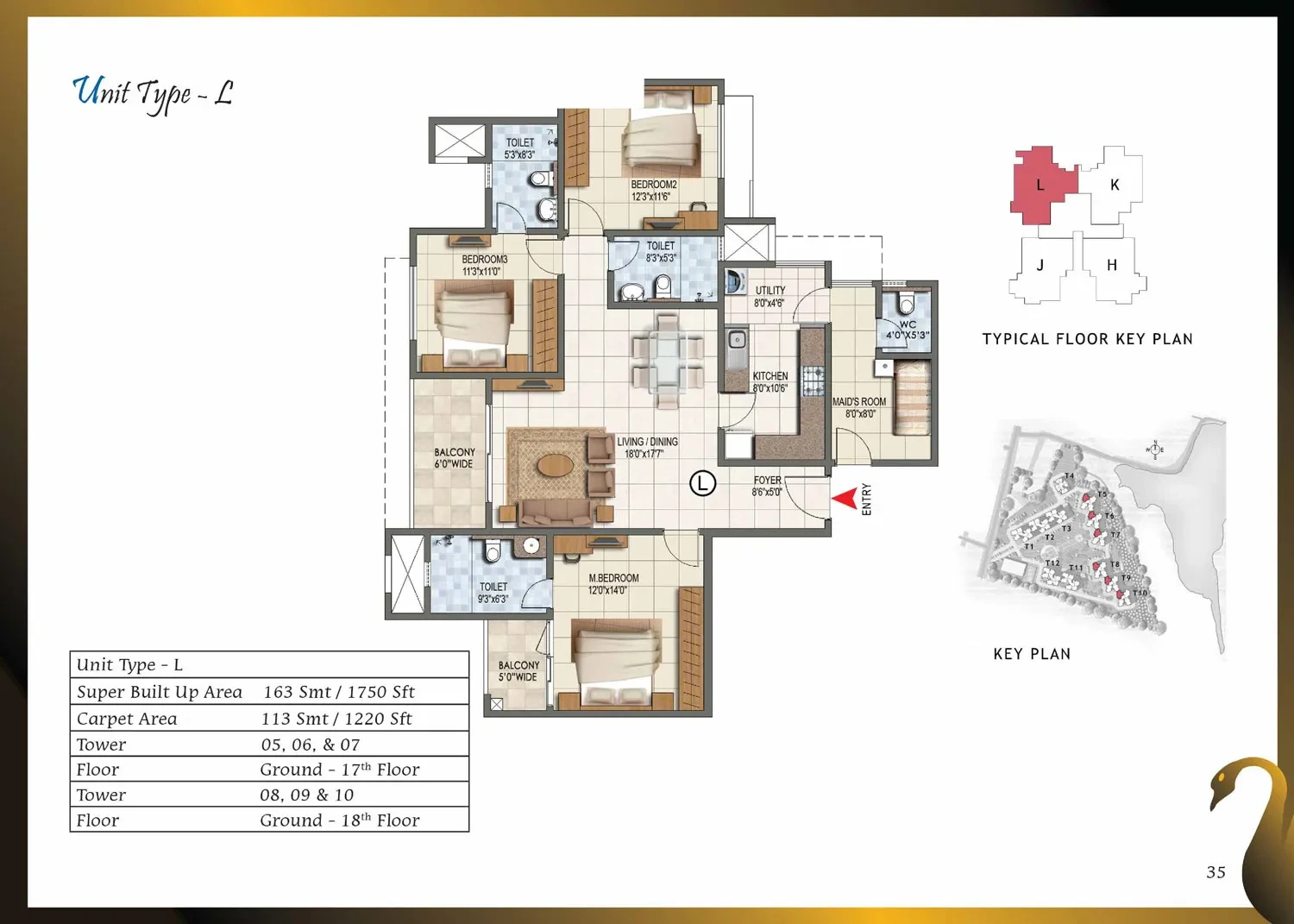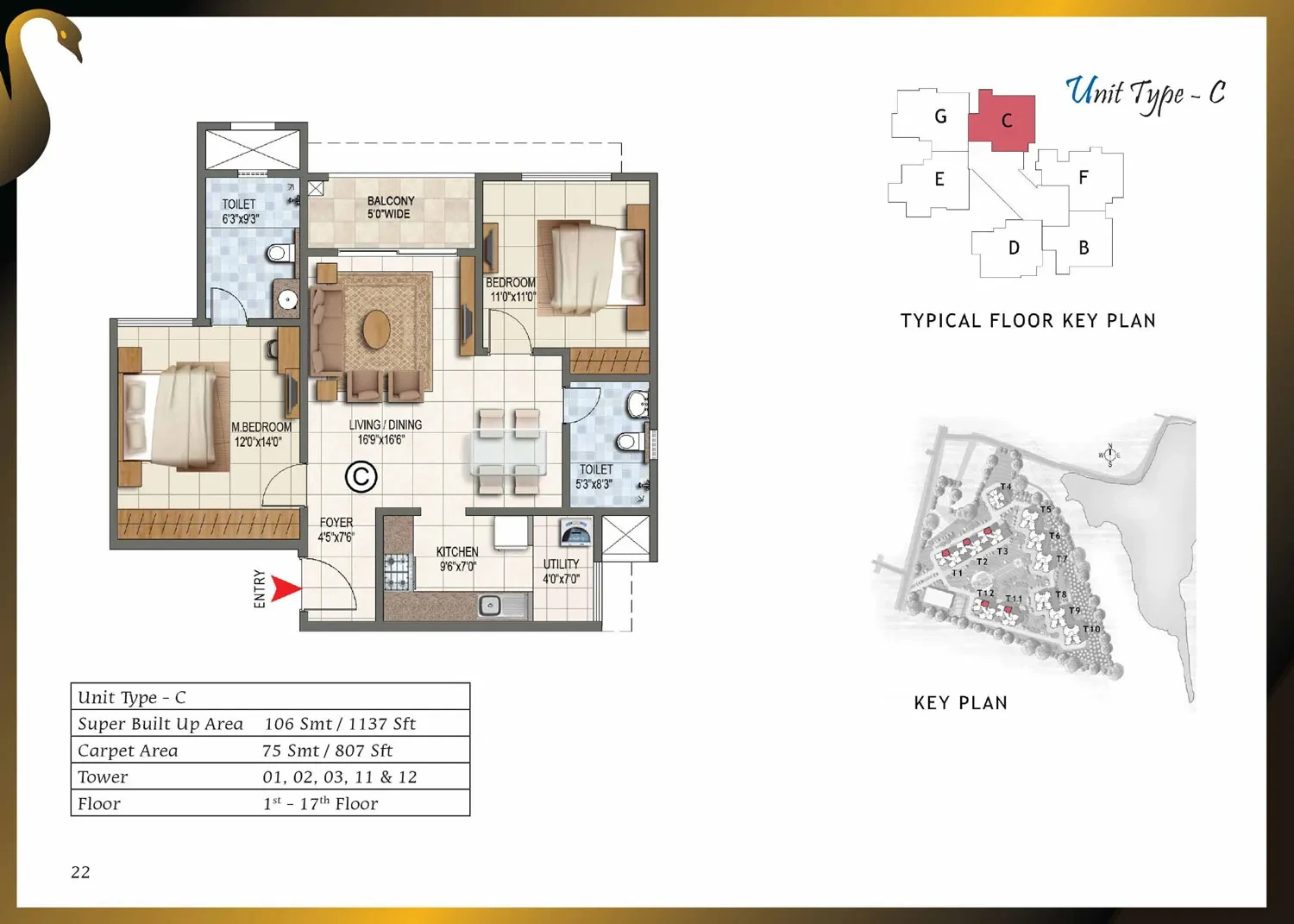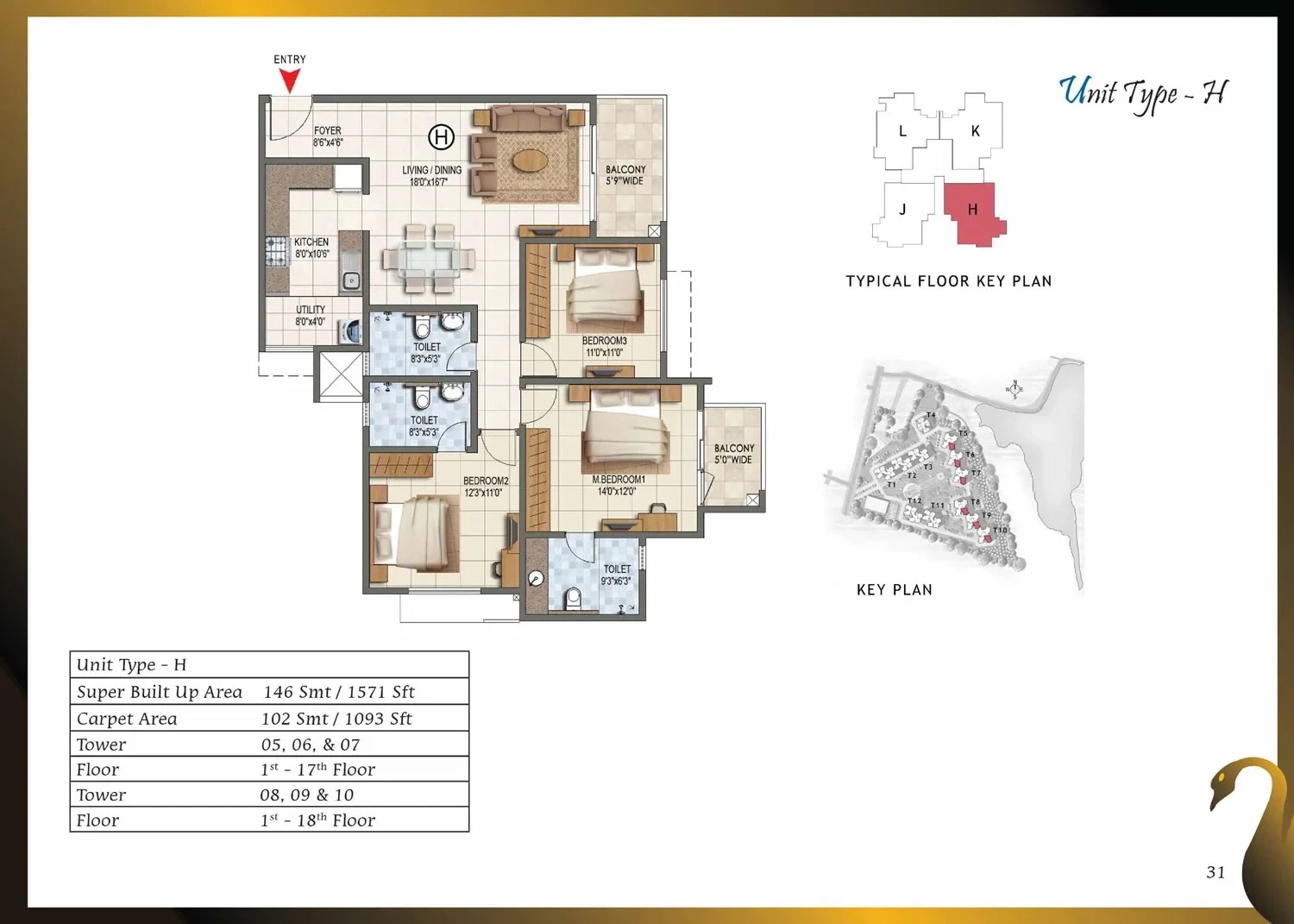 CategoryDetailsStructure & WallsRCC framed structure with cement blocks used for walls wherever required.Towers / Floors12 towers, each with Ground + Lower Ground + 17 or 18 upper floors.Unit Types & Sizes1, 2, 2.5 & 3-BHK units; sizes range approximately from 661 sq.ft to 1,750 sq.ft.Lobby / Common AreasGround-floor lobby in granite or marble; upper-floor lobby in vitrified tiles; lift cladding in granite/marble; lobby walls with texture paint and ceilings in distemper; staircases finished in Kota stone.Flooring (Apartments)Vitrified tiles in foyer, living, dining, corridors, and bedrooms; anti-skid ceramic tiles in balconies.Kitchen & UtilityGranite countertop with ceramic tile dado up to 2 ft above counter; stainless steel sink with chrome-plated taps; ceramic/vitrified flooring; provision for exhaust fan.Toilets / BathroomsAnti-skid ceramic tiles for flooring; wall tiles up to false ceiling; granite counter wash basin in master toilet; pedestal basins in others; wall-mounted EWCs; concealed piping; geyser provision.Doors & WindowsMain door with solid wood frame and polished flush shutter; internal doors with wooden frames and laminated shutters; UPVC/aluminium windows with sliding shutters and mosquito mesh provision.Electrical & PowerConcealed copper wiring with modular switches; adequate power points; provision for ACs in bedrooms; ELCB and individual meters; 100% power backup for common areas and apartments.Paint & FinishesExterior with textured paint; interiors in oil-bound distemper; enamel-painted railings.AmenitiesClubhouse, swimming pool, gym, jogging track, landscaped gardens, children’s play area, multipurpose hall, badminton, squash and tennis courts, CCTV surveillance, 24/7 power backup and security.
